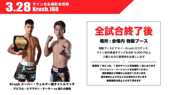 「Krush.188」3.28(土) 後楽園 メインイベント勝者サイン会&撮影会開催が決定!