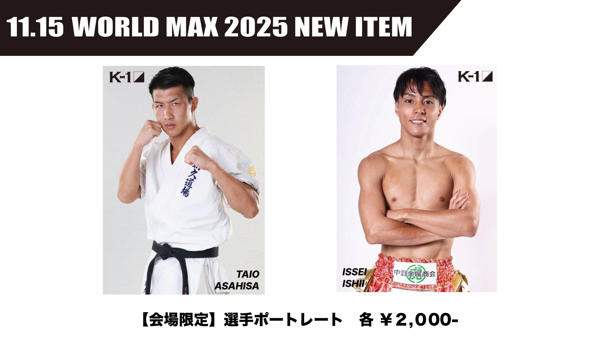 【選手ポートレート発売!】「K-1 WORLD MAX 2025」11.15(土) 代々木第一体育館 グッズ会場販売情報 2025.11.11 来る、11月15日(土)「K-1 WORLD MAX 2025~-70kg世界最強決定トーナメント・決勝ラウンド~」国立代々木競技場 第一体育館大会にて、新たに販売するグッズ情報をお知らせします。ぜひ会場物販コーナーにお立ち寄りください。<商品詳細>・【朝久泰央】ポートレート・【石井一成】ポートレート・価格:各2,000円