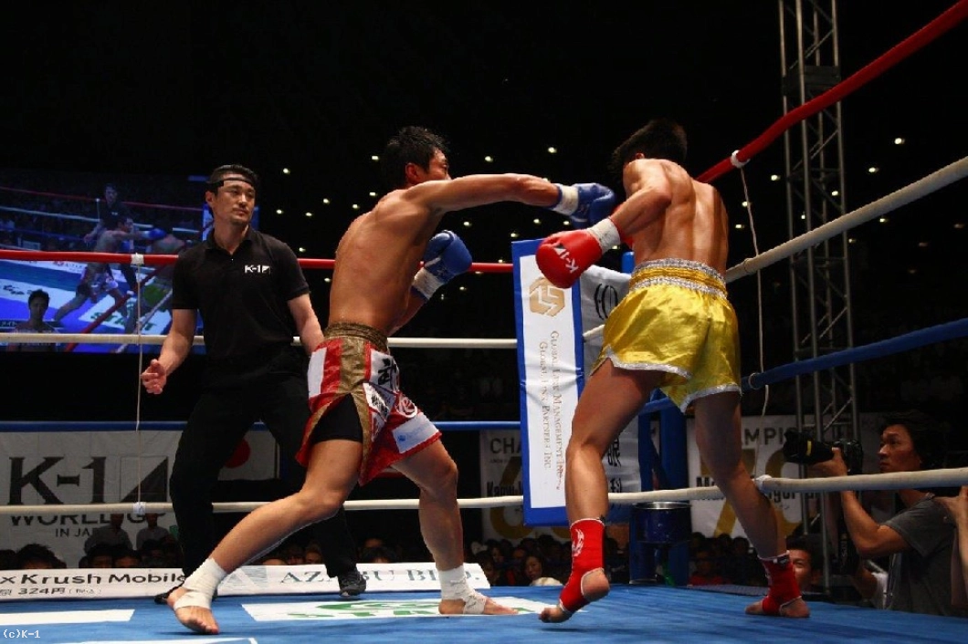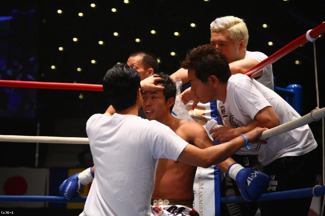 さらに小宮山はジャブと前蹴り、左右連打でユンを下がらせ優勢。だが、ユンは前蹴りでボディを効かされても前に出てきて、左フックで小宮山をとらえる。小宮山はバックステップ、サイドステップで間合いをはかりながら応戦するが、ここでもユンが左フック、右ストレート。小宮山はこれに顔面前蹴りを返し、ユンのアゴを跳ね上げる。