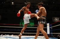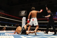 1R、軍司はサウスポーの大岩に対しジャブを突き、周囲を回る。しかし大岩も左ストレートをヒット。軍司は左三日月蹴りをわき腹に入れ、さらなる攻め手を探るが、ここでも大岩が左ストレートでとらえる。だが軍司は前に出て右ストレートを当てると続いて跳びヒザでもヒットを上げ、ボディフック、ボディへのヒザと決め、この後の右ストレートで大岩を倒す。残り時間は10秒を切っていたが、軍司は打ち合いに臨み、右ストレートで2度目のダウンを与えて初回を終える。