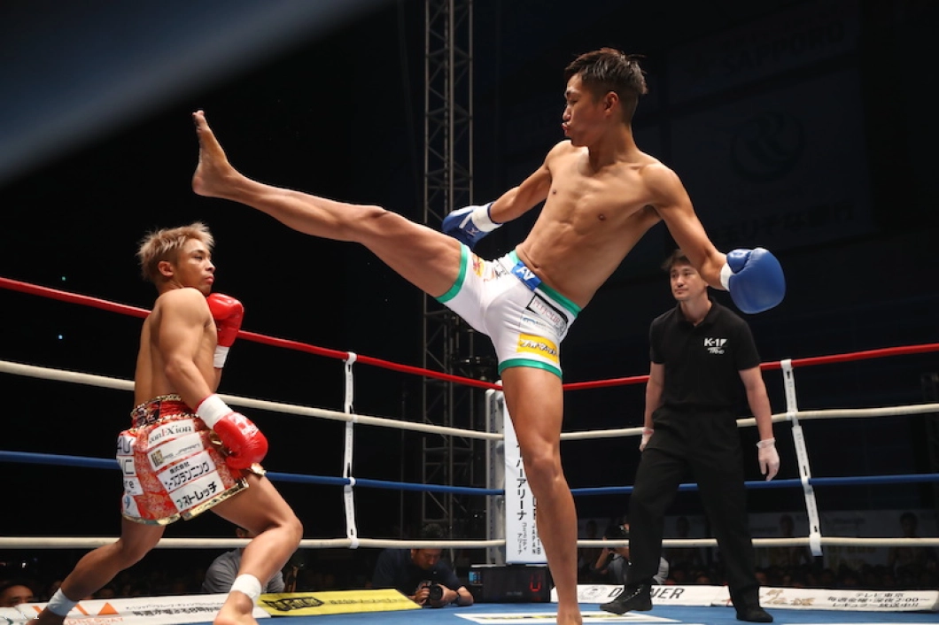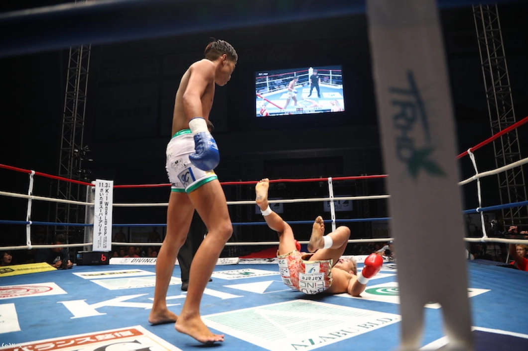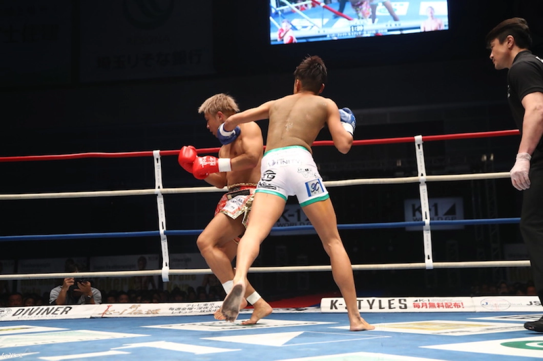 1R、芦澤は開始からハイキック、後ろ回し蹴りを連係して放つも、小澤はこれを見切ってかわす。小澤は打ち気にはならず、冷静に距離を作って芦澤の動きを見て、芦澤の動きにフックを合わせる。しかし芦澤は小澤のパンチをかわして左ストレート、ヒザ、右ストレート、左フックと打ち込み、先制のダウンを奪う。
