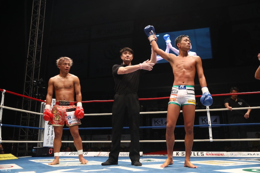3R、小澤はミドル、後ろ回し蹴りを繋いで前に出る。しかし芦澤はリングを自在に回り、距離ができると顔面への前蹴りを飛ばす。セコンドの「遊べ」という声の通りに自由な動きを見せ、小澤に付け込ませない芦澤。小澤はボディストレートから活路を切り開かんとするが、ステップを止めない芦澤を捕まえらない。小澤は距離を詰めてヒザを突き上げるが、芦澤は左右のストレートで応戦する。判定は30-27、30-27、30-27の3-0で芦澤。因縁の対決で2度のダウンを奪い勝利した。