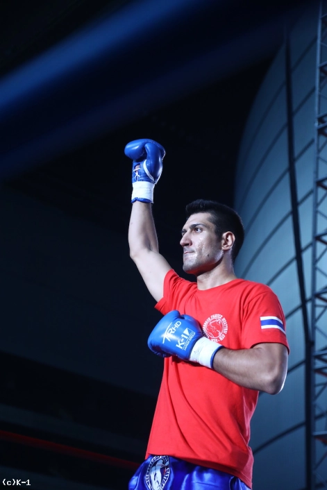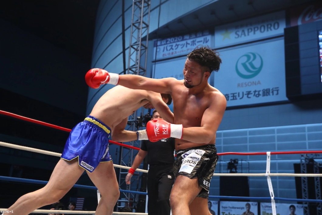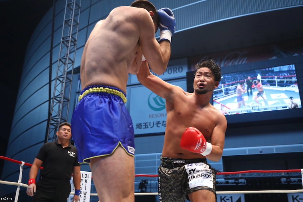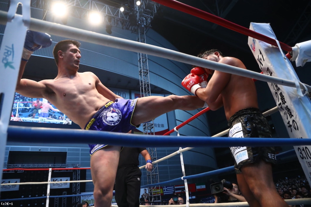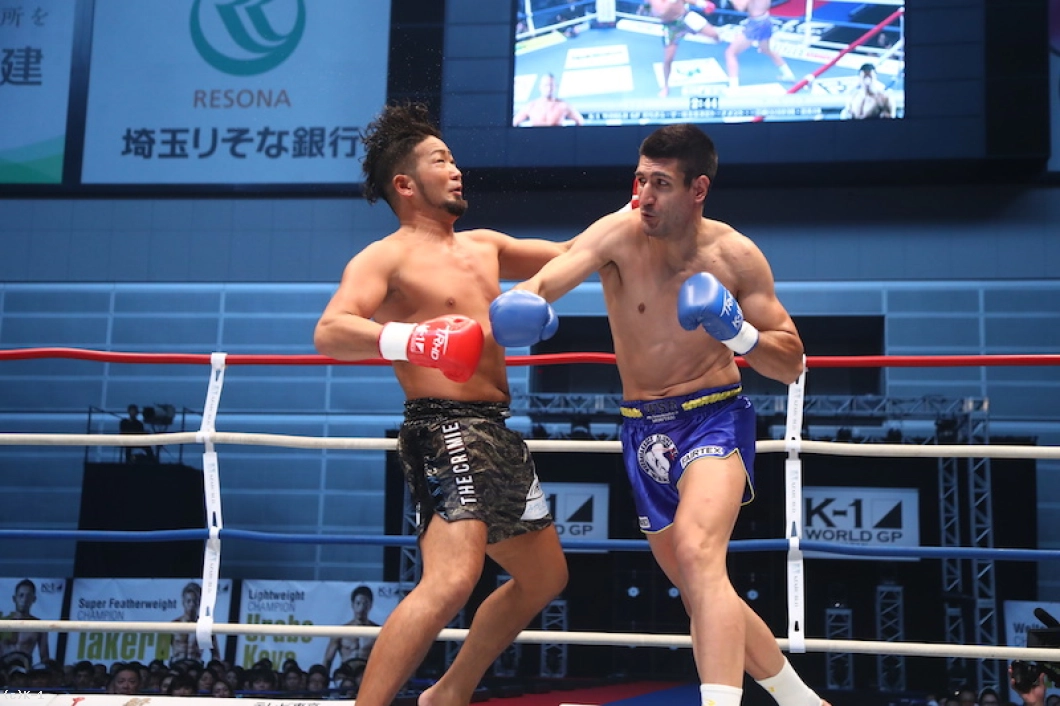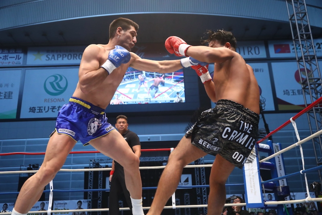 1R、18㎝の身長差があるOD・KENだが、臆さずパンチを振るっていく。しかしカリミアンは打ち下ろしの右ストレートをヒット。OD・KENは右のパンチをクロス、フックと使い分けて当てるが、カリミアンはこれに動じた様子を見せず前に来る。さらにカリミアンは跳びヒザからボディへのヒザを突き刺す。OD・KENもそこにクロスを合わせ、左ボディを効かせてカリミアンのガードを落とす。