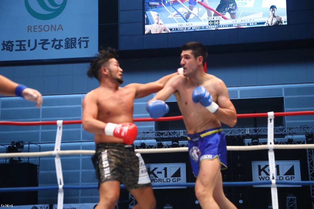 2R、2mの巨体にも関わらずカリミアンは跳び後ろ回し蹴りといった大技を見せる。打ち下ろしの右ストレートを当てたカリミアンだが、その後のヒザが下腹部に当たってしまい、OD・KENのダメージ回復に時間が取られる。 再開するとカリミアンは再び跳び後ろ回し蹴り。しかしOD・KENはこれに構わず右ストレートを当てる。カリミアンは時折組みついてしまうが、右ストレートを強振してOD・KENの足を止める。OD・KENもこれに応じて右ストレートを打ち返す。