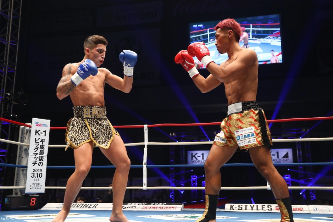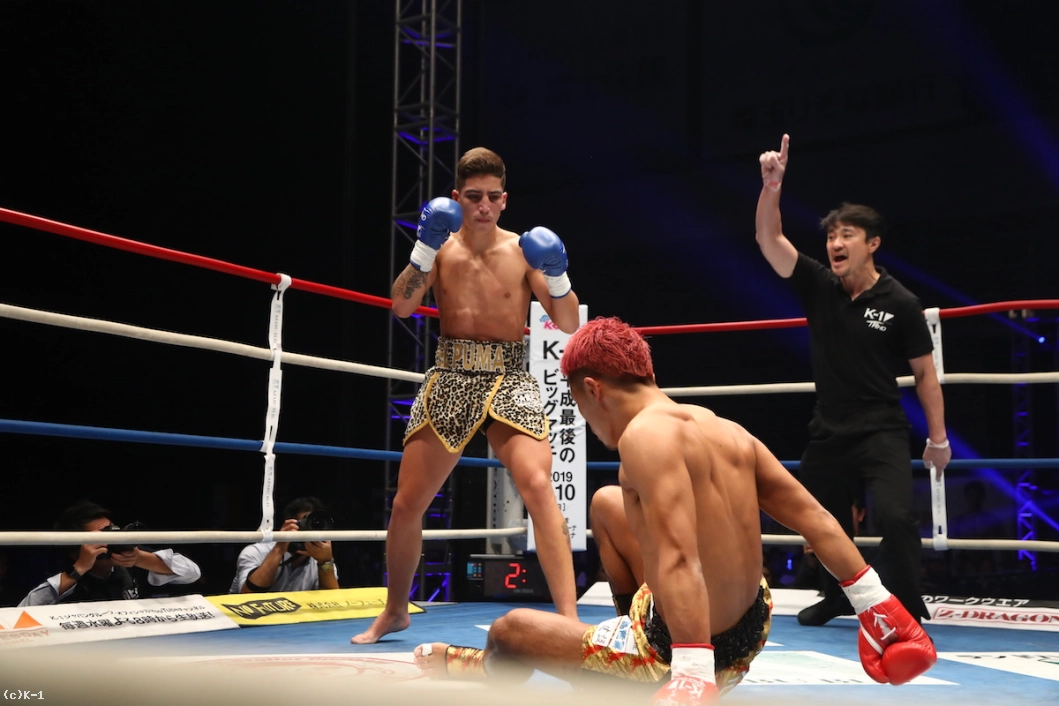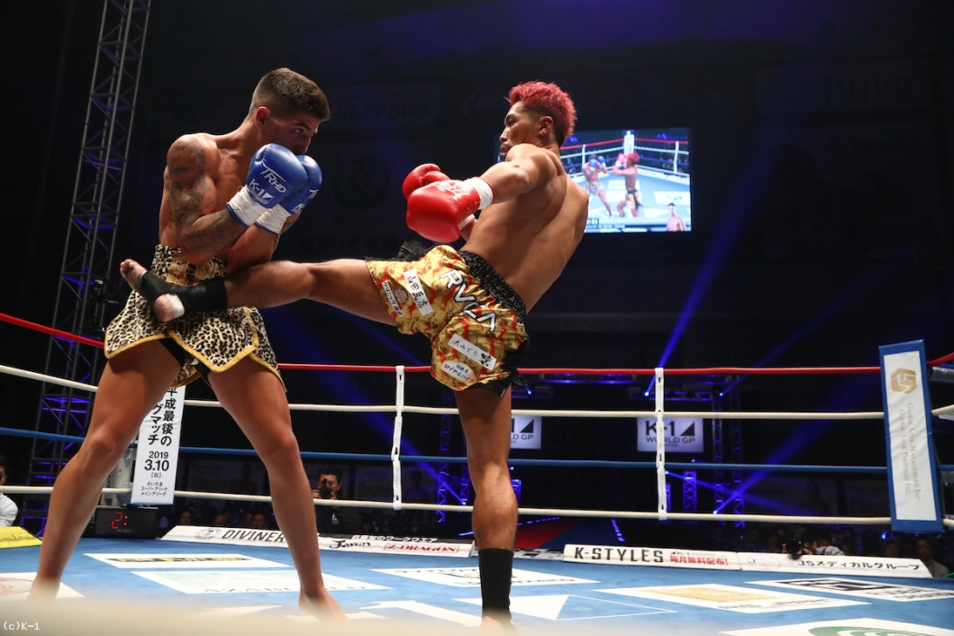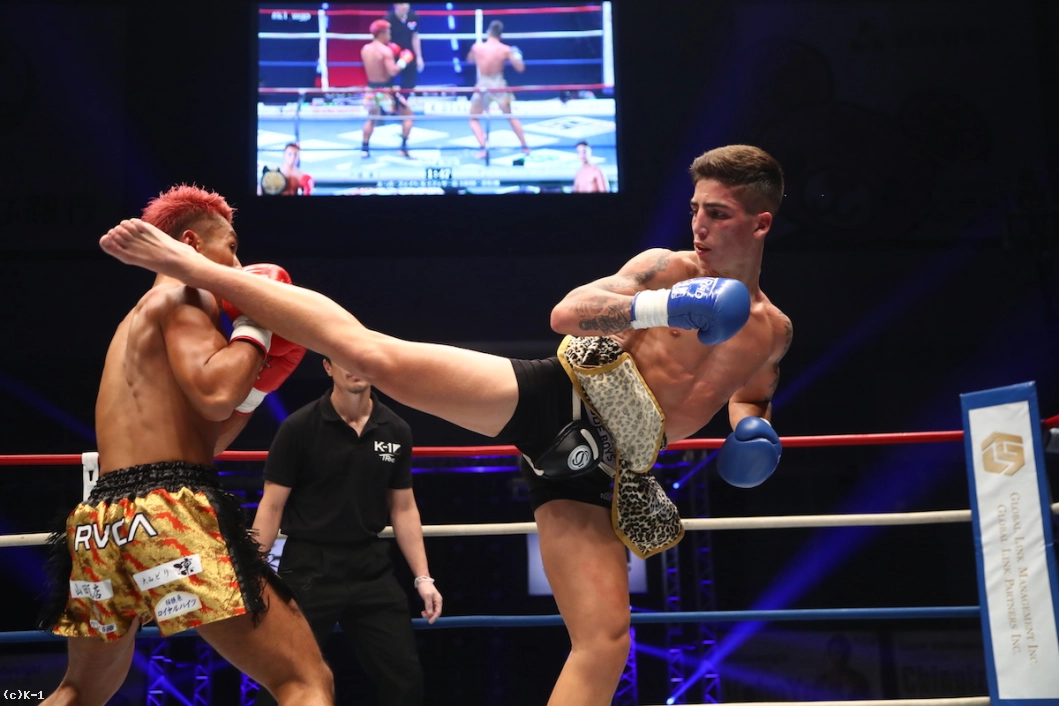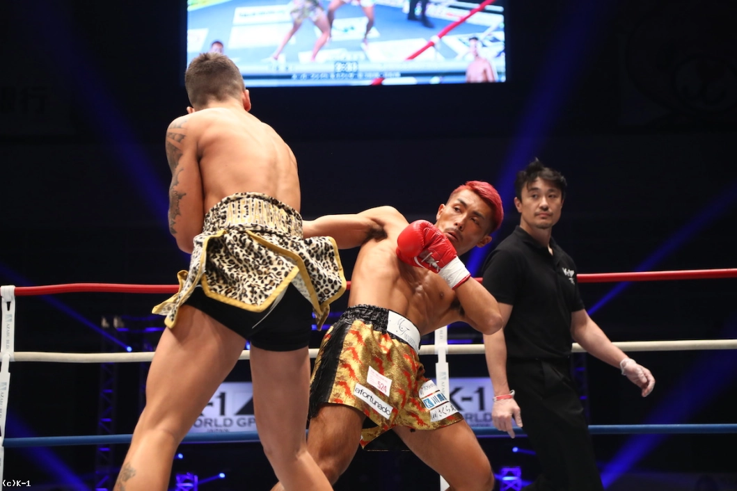 1R、オーソドックスのリーバスに村越は左ミドルを放って様子を見る。左前蹴りを打ち込む村越だが、リーバスが返した右ストレートからの左フックを被弾しダウンを喫してしまう。リーバスは動きが機敏で目がよく、村越の蹴りを当てさせずかわしていく。