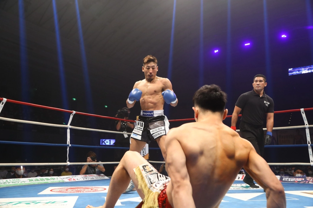 2R、不可思は前に出て右ローを当てていく。だが平山は押し戻してジャブと右ストレート。不可思は右ローを増していく。平山は足が効いたか、腰が引け始める。不可思はガードを固めて、ロー主体の攻めとなる。不可思はさらに右ローを増してペースを取るが、ここで平山がモーションの少ない左フックでダウンを奪いラウンドを終える。