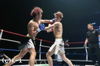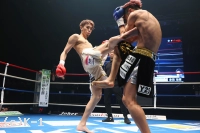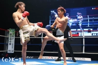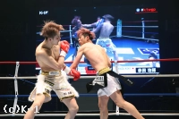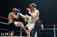 2R、蹴ってくる北村に赤田のインローがヒット。北村はボディ、顔面にストレート。中盤、赤田はヒザを当てる。北村もロープに詰めてヒザ、パンチで攻める。赤田は突進して左をヒットするが、北村はパンチからヒザにつないで反撃。
