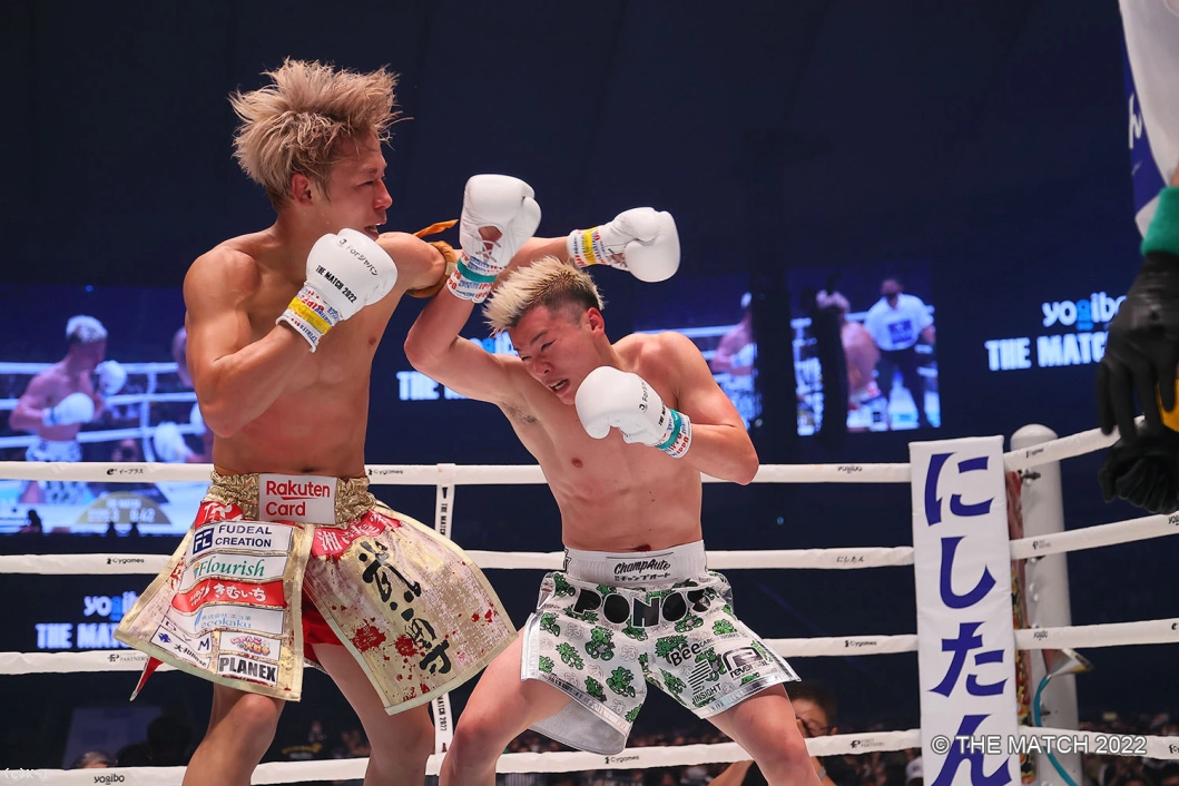 1R、サウスポーが那須川。中央に陣取るのは武尊。那須川は強い左ミドル、二段蹴りと蹴りを繰り出す。武尊は細かい左ローを見せながら前進。那須川は手数を出し左ストレート、右ジャブを武尊の顔面に浅くヒットする。圧力をかける武尊の入り際に那須川が右ジャブ。真っ直ぐ下がる武尊に右アッパーから左ストレート。ラウンド終盤には武尊がプレッシャーをかけるが、武尊の左フックに合わせた那須川の左ストレートでダウンを奪う。