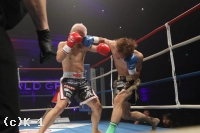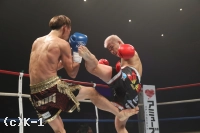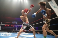 1R、堀井は左ローキック、左ミドルキックで揺さぶる。岩KINGはローキックも、堀井は右アッパー、右フックをヒット。岩KINGはパンチも、堀井のパンチ連打でロープを背にガードをかためる。堀井の右が入り、岩KINGも右を返す。そして岩KINGはカーフキックを連発した。