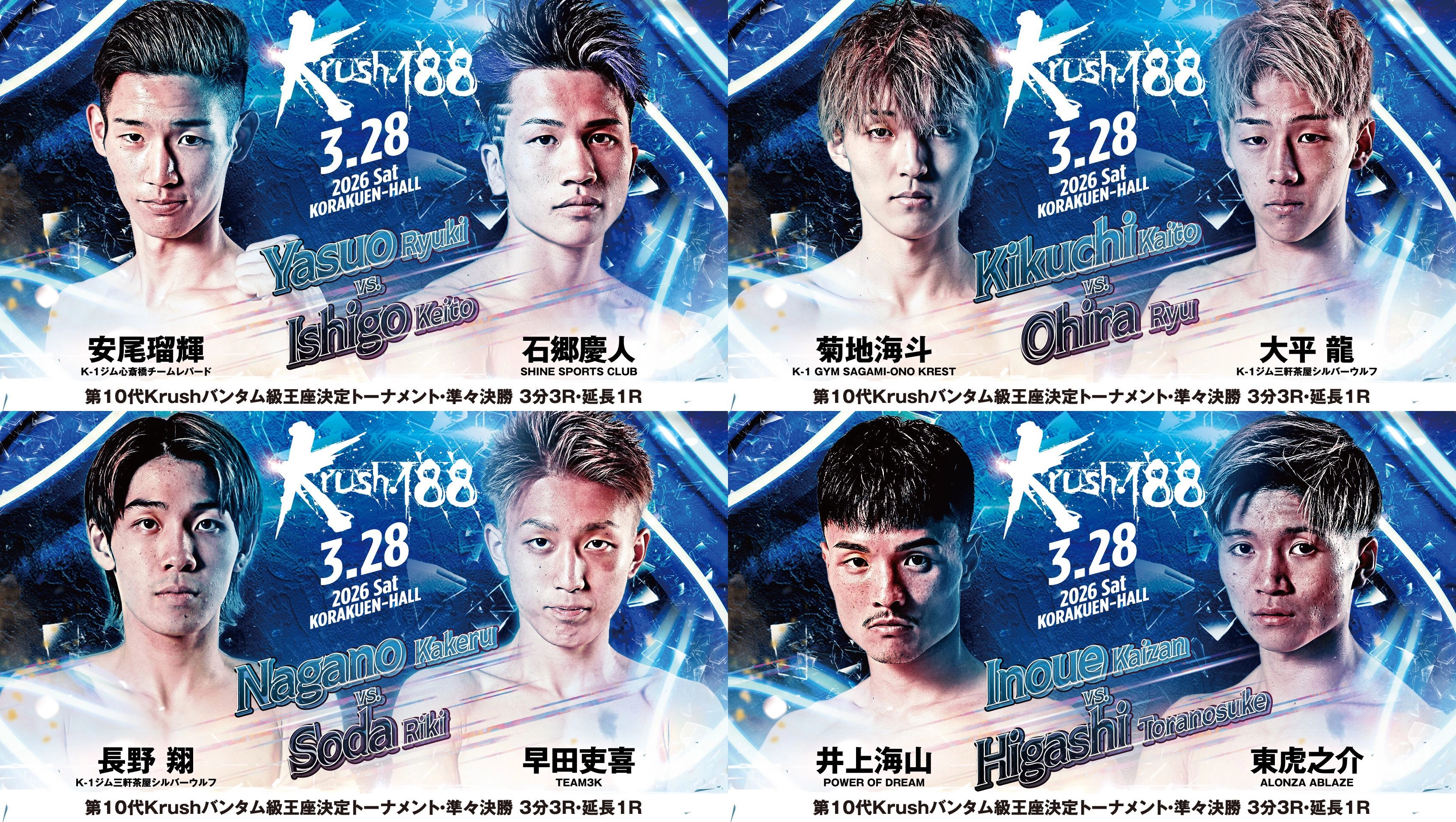 来る3月28日(土)後楽園ホールにて開催される「Krush.188」の10カードが決定しました。各選手のプロフィールとカードは以下をご参照ください。