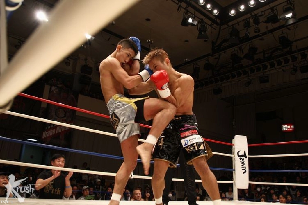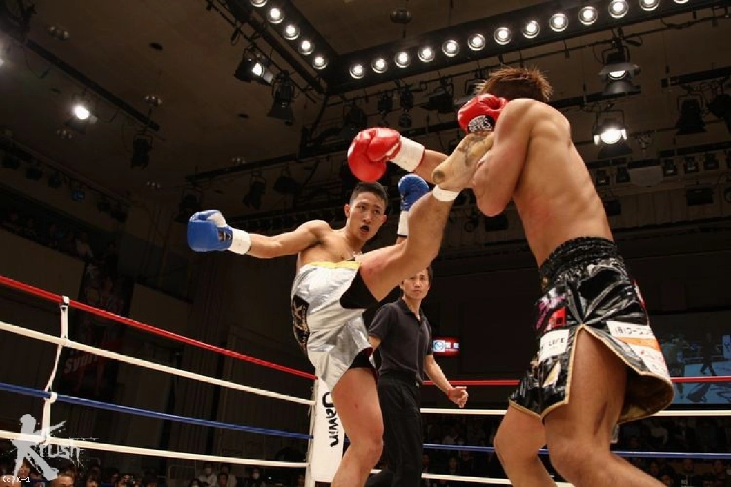 1R、サウスポーの小澤に対して、伊藤が蹴りを見せながら前進。小澤も左ミドルを蹴り返し、左フックからパンチをまとめて前に出る。伊藤は右ミドルを蹴って、右の飛びヒザ蹴り。小澤も左ストレートから手数を増やす。