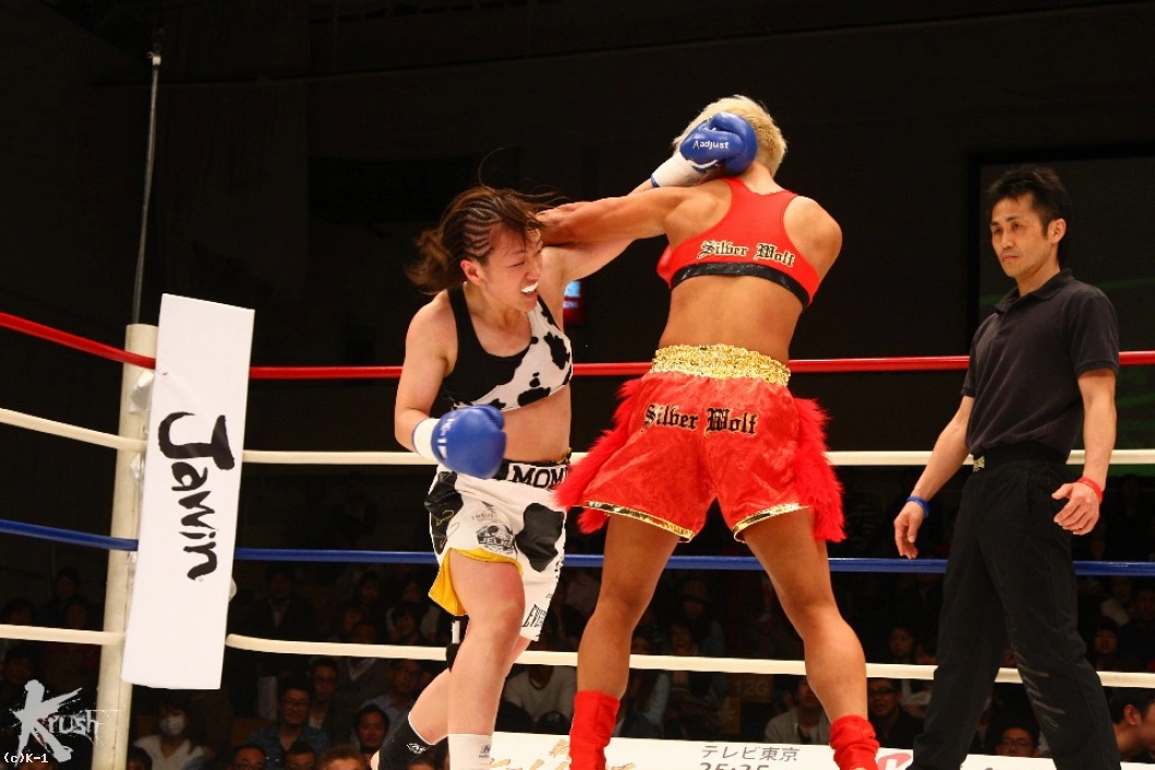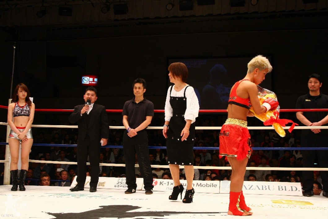 試合前には女子キックボクシングの伝説的存在である熊谷直子から両者に花束が贈られる。