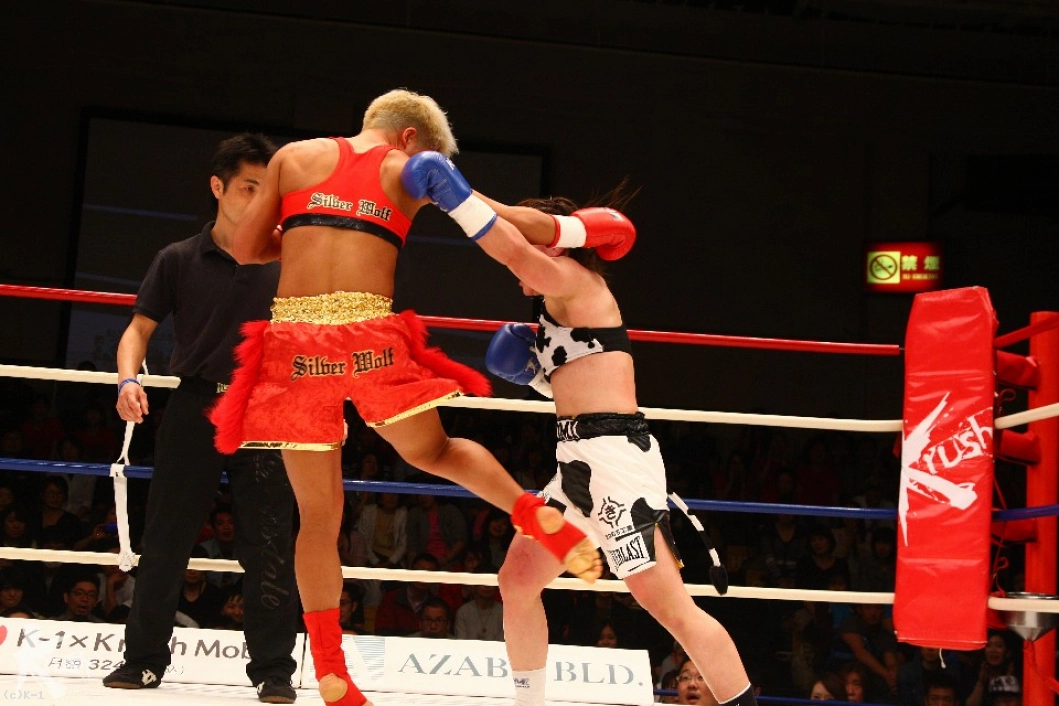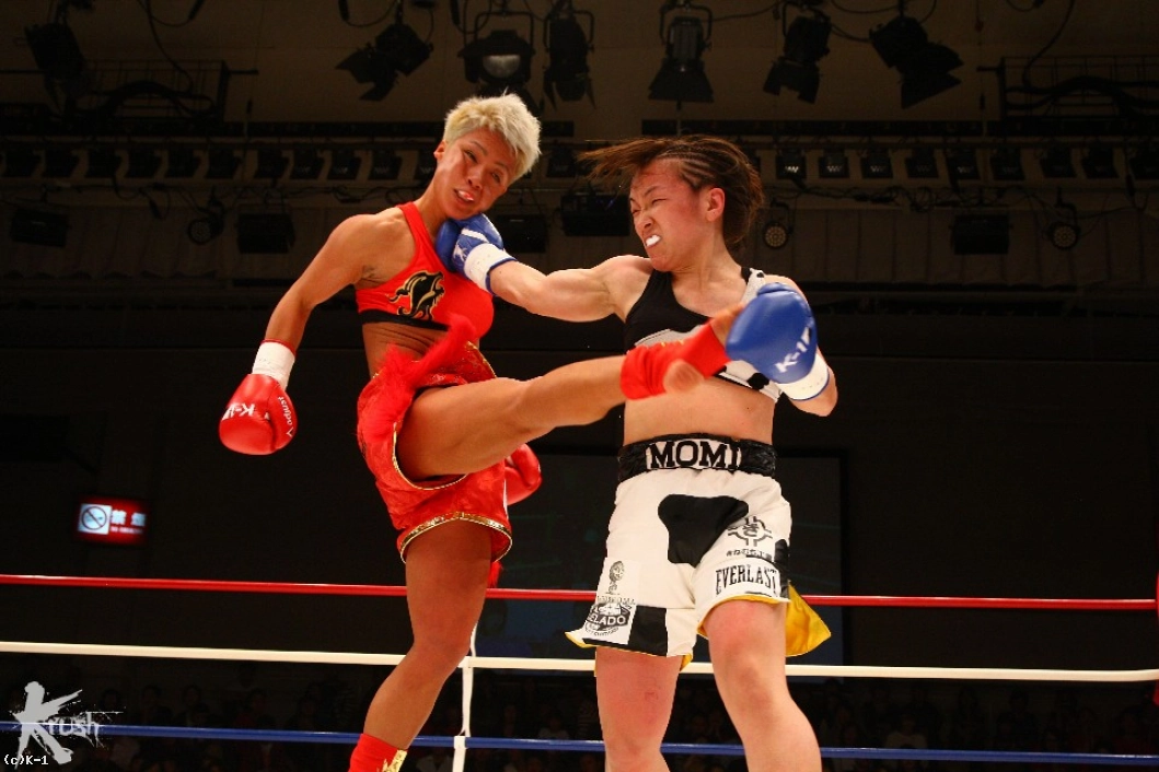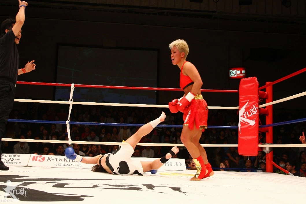 3R、紅絹はこのラウンドもヒット・アンド・アウェーを見せるが、KANAは下がったところをプレスして前に出る。そして近距離での打ち合いから右ショートストレート、右ハイキックをヒット。しかし打ち合いに戻ると紅絹が左ストレート、左フックを当て返す。だが、KANAも左フックをクリーンヒット。ローキックも紅絹の出足を止めている。KANAは前蹴りをボディ・顔面と打ち分け、右・左とパンチのヒット数を上げていく。左ボディフックを打ち込む紅絹だが、KANAは止まらない。左右フックから再度の顔面前蹴りを打ち込み、紅絹が前に来るとカウンターの左ハイキック。これで残り30秒のところでダウンを奪う。立ち上がった紅絹にKANAは右クロスから左ハイキックを見舞って終える。