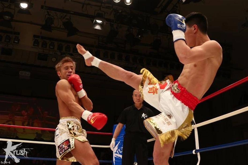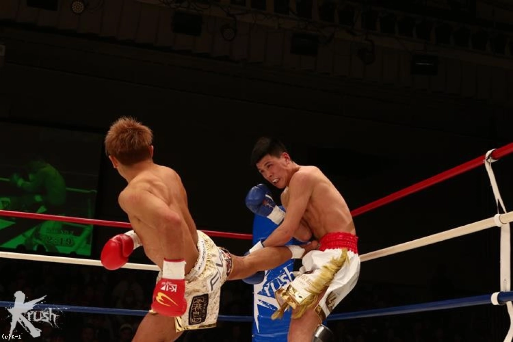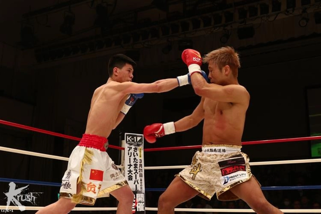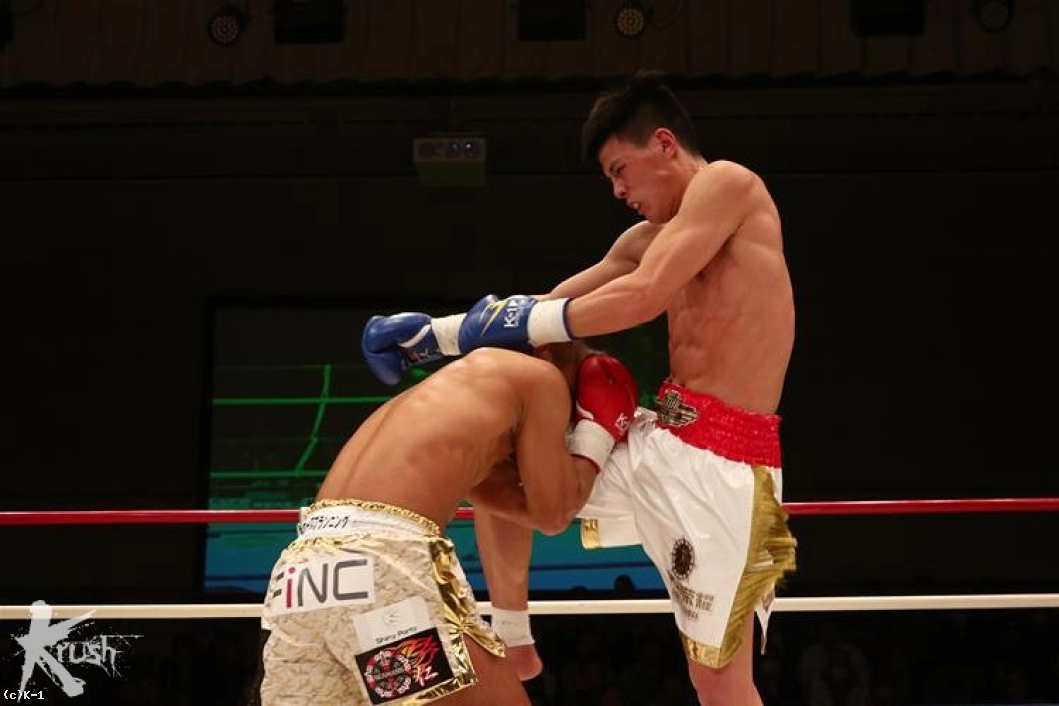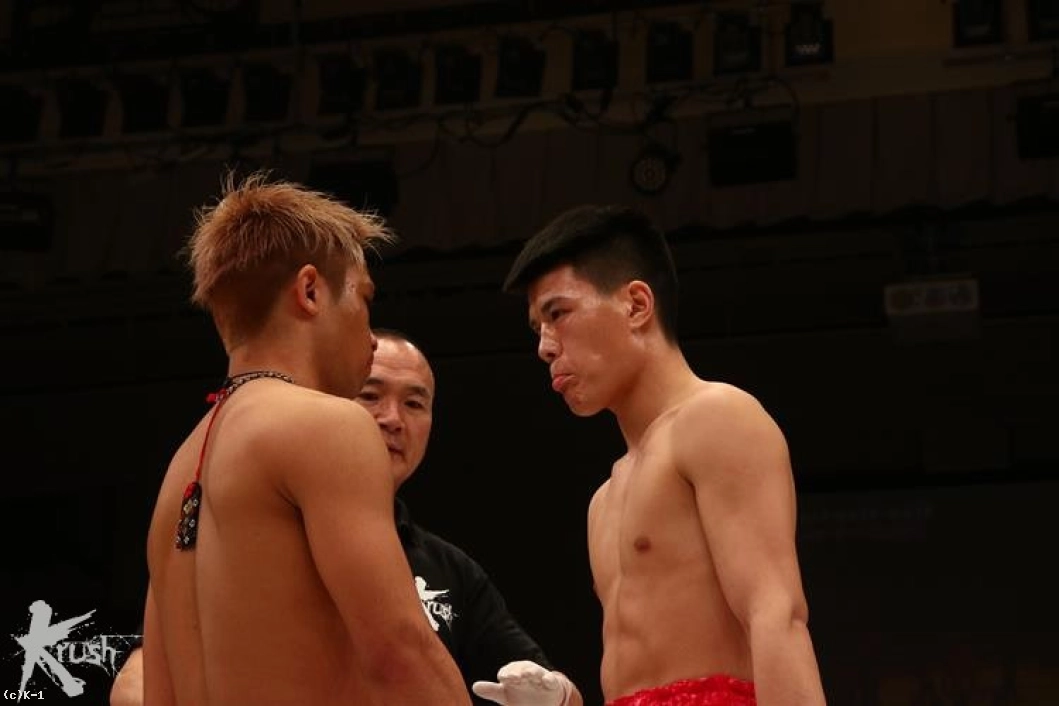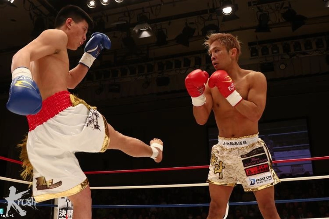 1R、サウスポーの小澤に対し、ユンはオーソドックスで向き合い、速く鋭い左ローを見舞う。小澤は重心を落とした構えでにじり寄り、後ろ回し蹴りを放つも、ユンはこれを当てさせない。そして跳びヒザを放ち、そこからら右フックを連打してユンをロープに追い込みバックブローを見舞う。ユンはこれをヒジだとアピールするが、小澤はサイドキックを連続で入れてユンを後退させる。ユンが放ったハイキックを小澤がかわすと、ユンは「やるな」とばかり笑みを漏らす。