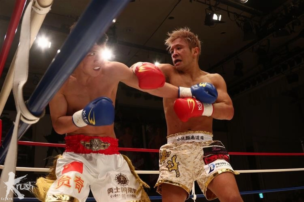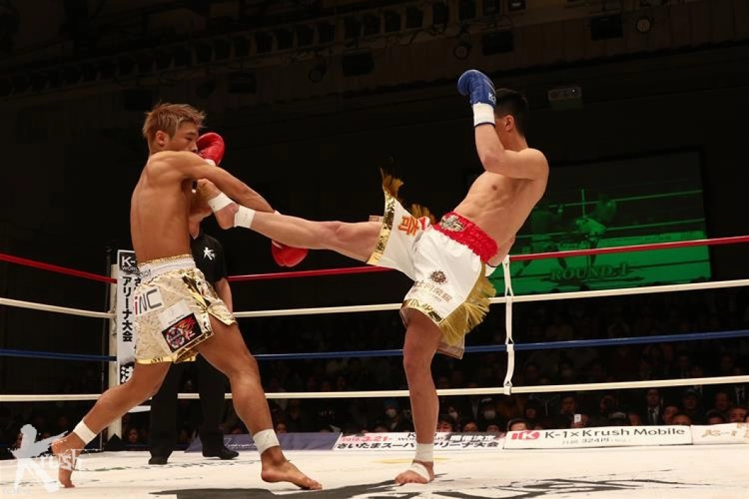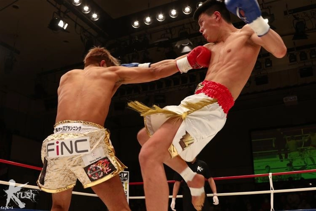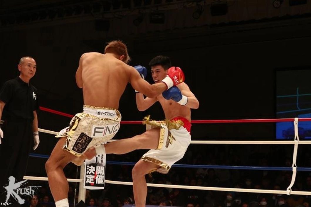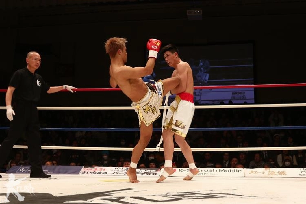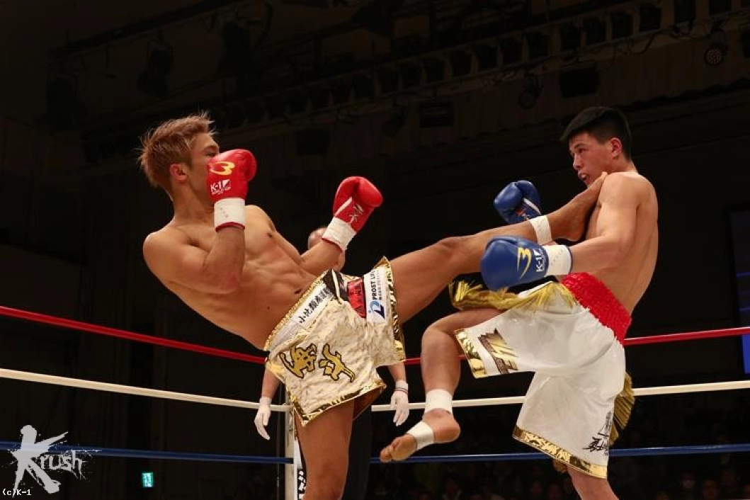 1R、サウスポーの小澤に対し、ユンはオーソドックスで向き合い、速く鋭い左ローを見舞う。小澤は重心を落とした構えでにじり寄り、後ろ回し蹴りを放つも、ユンはこれを当てさせない。そして跳びヒザを放ち、そこからら右フックを連打してユンをロープに追い込みバックブローを見舞う。ユンはこれをヒジだとアピールするが、小澤はサイドキックを連続で入れてユンを後退させる。ユンが放ったハイキックを小澤がかわすと、ユンは「やるな」とばかり笑みを漏らす。