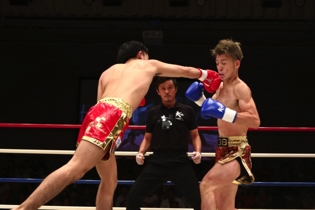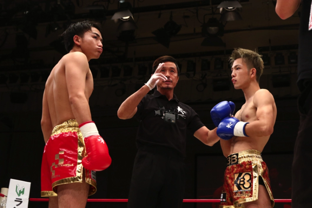 2R、玖村は跳びヒザ、左アッパー、ストレート、バックブローと勢いを落とさない。小倉はしかし鼻血を出しながらも右ローを連続で当て、右ストレートと左フックでも玖村をとらえていく。玖村は距離を作ってハイキックを打ち込むが、小倉はタフさと打たれ強さを見せ、左右フックをボディから顔面へと走らせる。