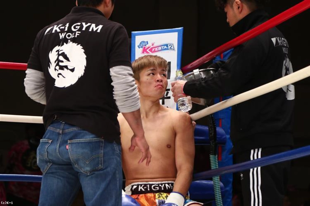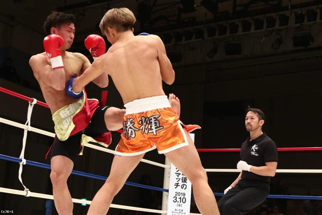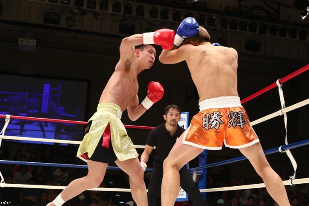2R、右ストレートを当てる勝輝だが、安達もすぐ右ストレートを当て返す。ボディを交えた速いコンビネーションで攻める勝輝だが、安達がプレッシャーを発して前に出る。しかし勝輝はボディアッパー、ヒザと攻撃を散らし、右ストレート、顔面前蹴りとヒットを増やす。パンチに加え右ローも入れ、勝輝はヒットを重ねていく。安達はダメージの蓄積から後退していくが、勝輝に対し左ボディを返す。