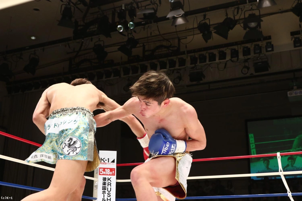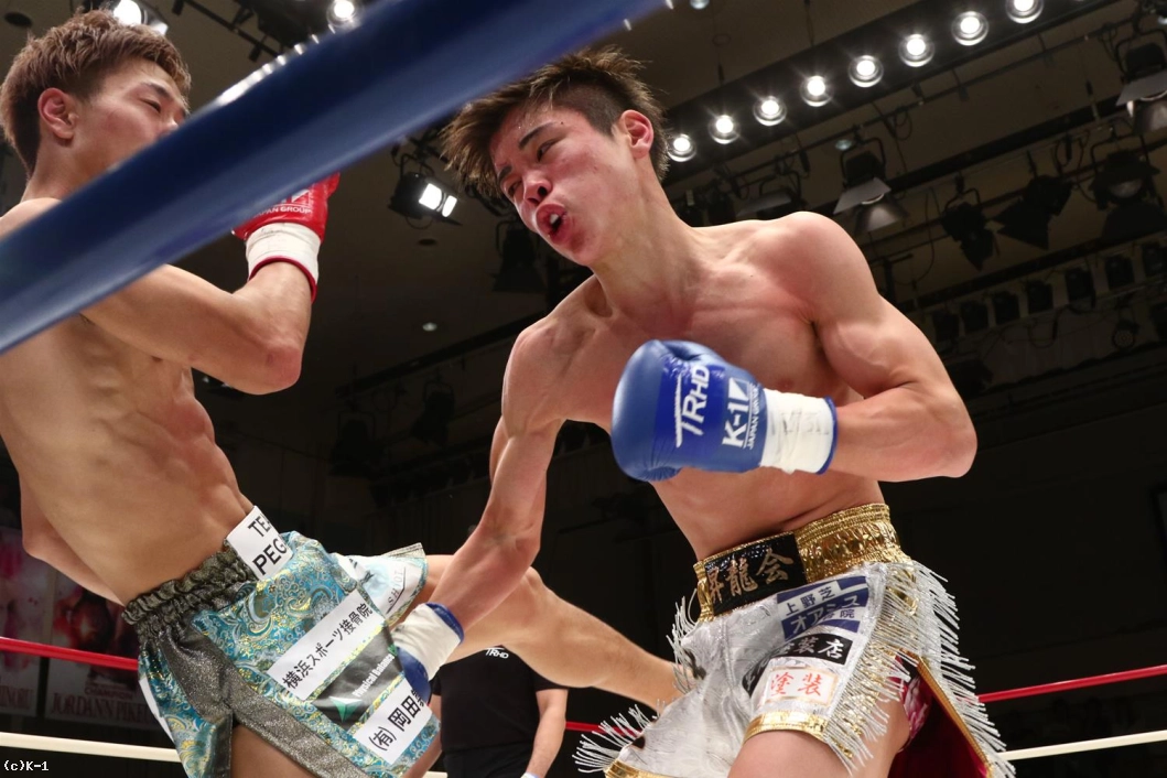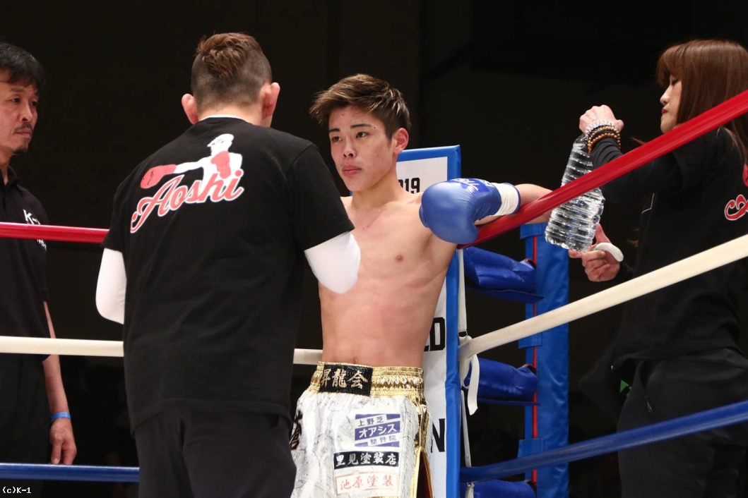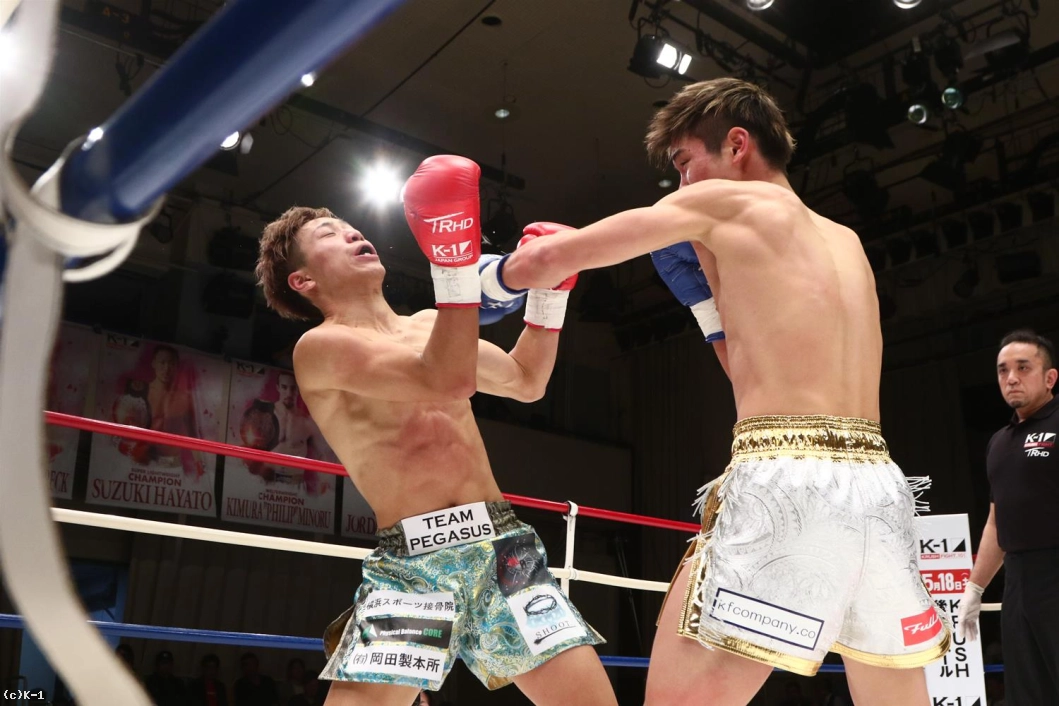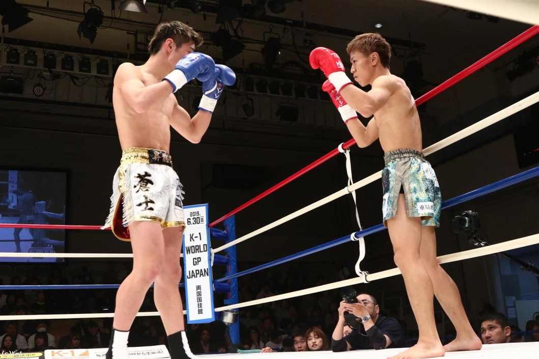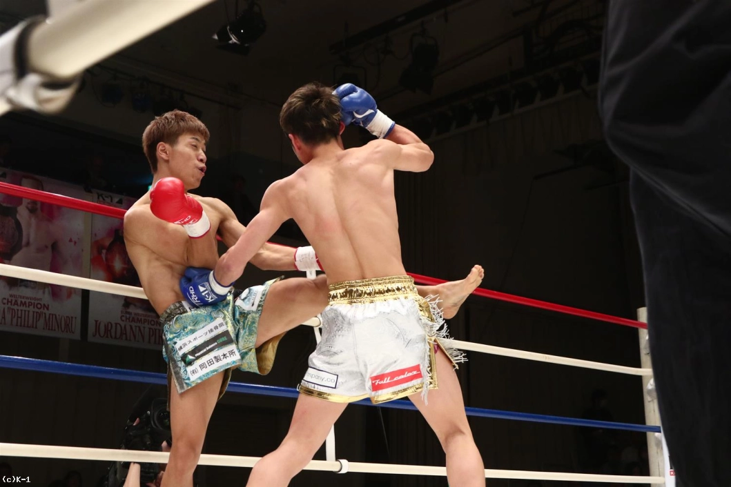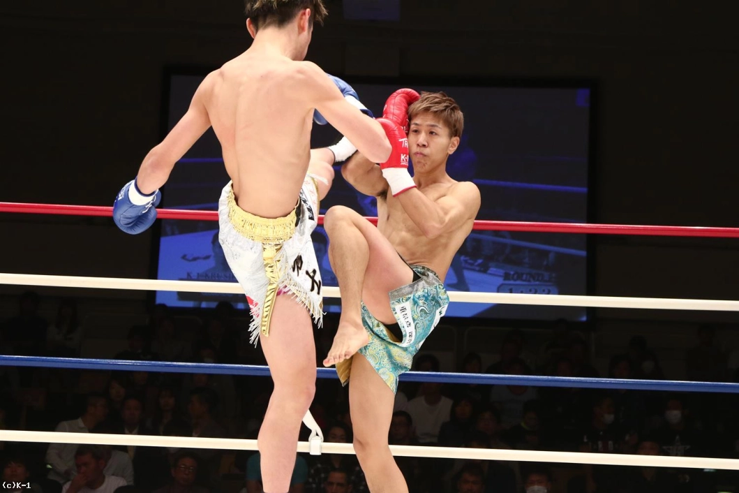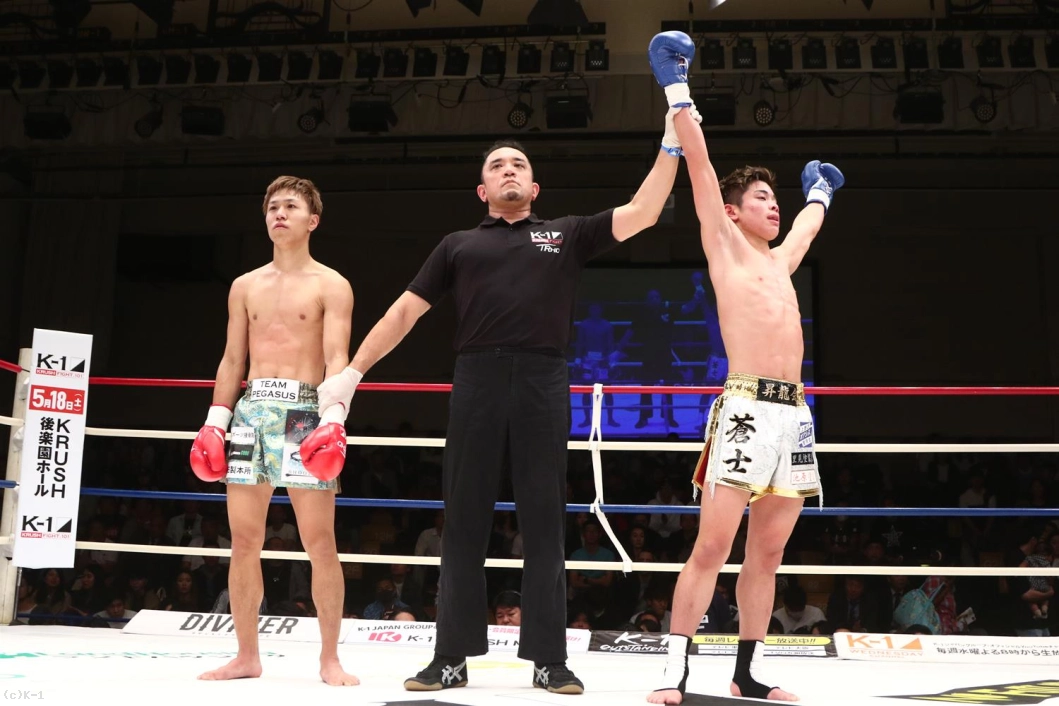 3R、ダウンを奪われた萩原は前に出るが、蒼士はそのジャブをかわしつつ左ボディフックのカウンター。さらに相打ちのタイミングでの左フック、右ストレートから返しの左フックと蒼士はパンチのヒットが目立ってくる。前に出んとする萩原だが、蹴りをキャッチする動きが多くなってしまいレフェリーから注意を受ける。試合最後も蒼士が左フックを当てて終える。判定は30-28、30-27、30-26の3-0で蒼士が勝利した。
