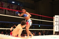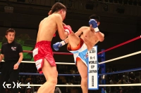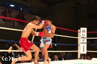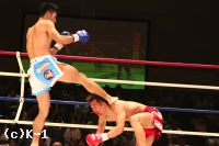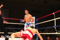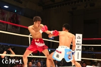 2R、中島は後ろ回し蹴りを連発で放つがこれはクリーンヒットできず。しかしボディへのヒザを安田に効かせ、コーナーに詰めてラッシュする。安田は鼻からの出血がヒドくなり、いったんドクターチェックが行われる。再開すると中島は左ハイを当て、その後で右顔面前蹴りで打ち抜きで安田をダウンさせる。