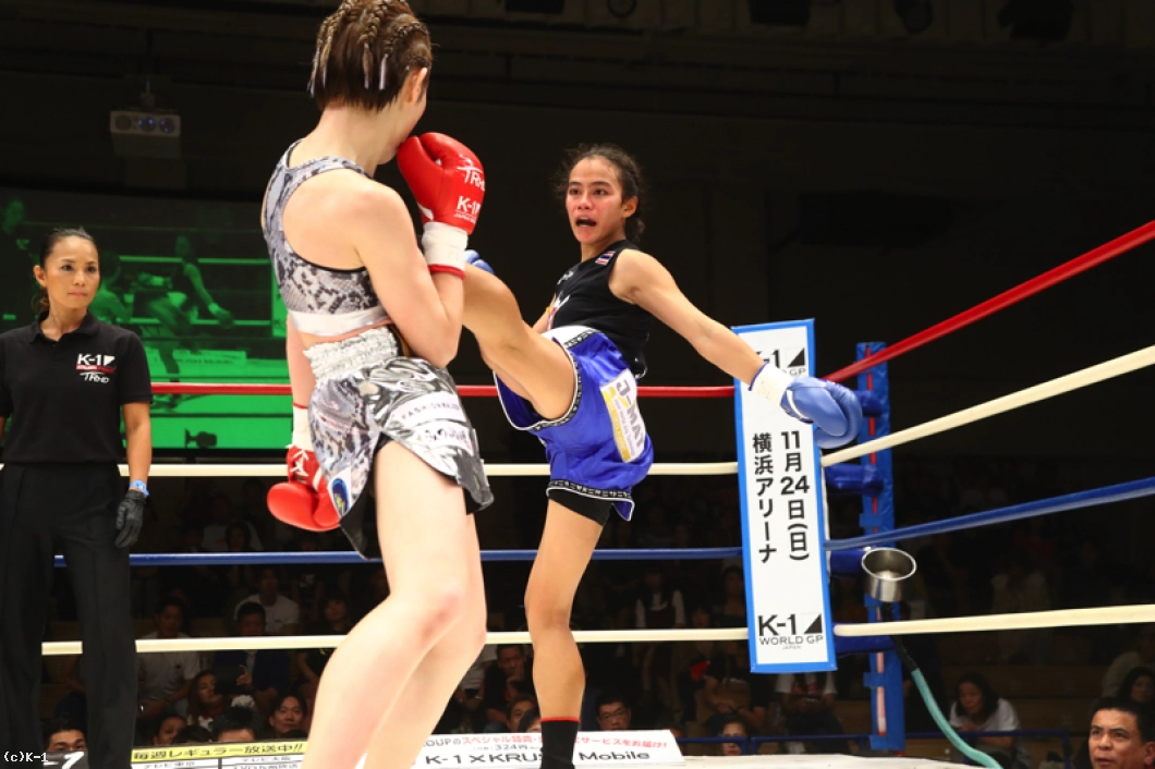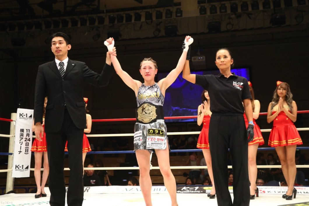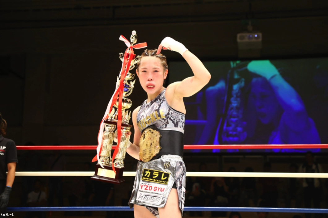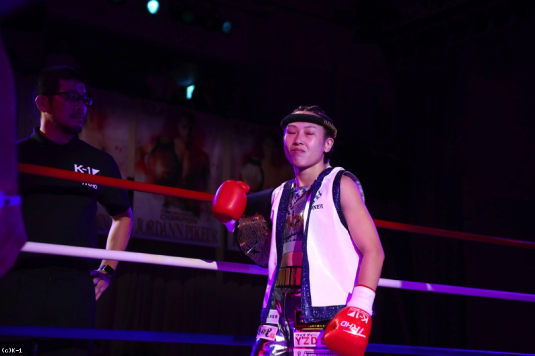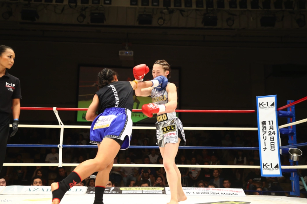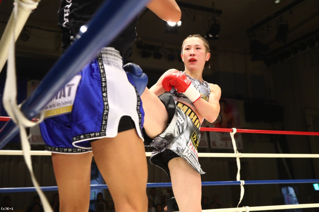 (判定を待っているときの気持ちは?)正直、ドローであってほしいという思いでした。(延長になったときは?)前に出るしかないと思いました。いまここで負けたらまたイチからのスタートになってしまうので。戦績を残している勝てばその先が見えると思い、気持ちだけで戦いました。(もしK-1で女子トーナメントが開催されれば興味はある?)いまの戦いかたで階級をあげるのは厳しいですが、練習次第だと思うので、チャンスがあれば出たいと思います。(今後の目標は?)強い相手を倒していける武器を磨いて、倒せる選手になっていきたいです」