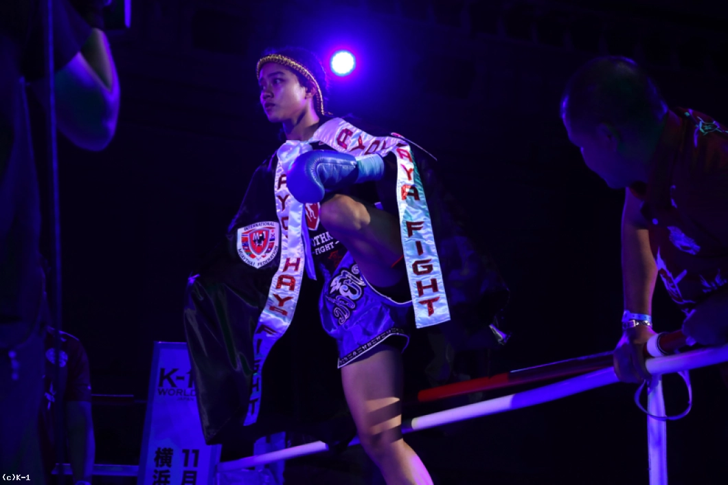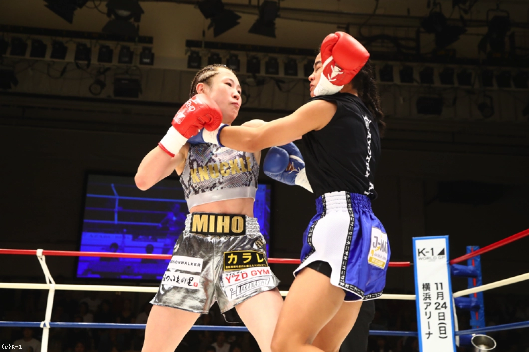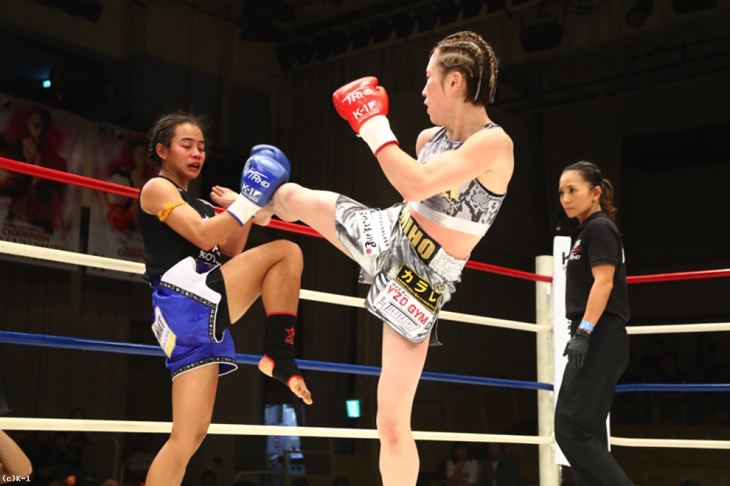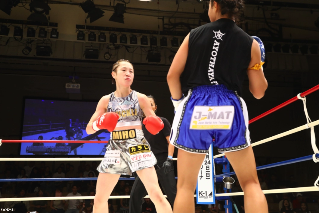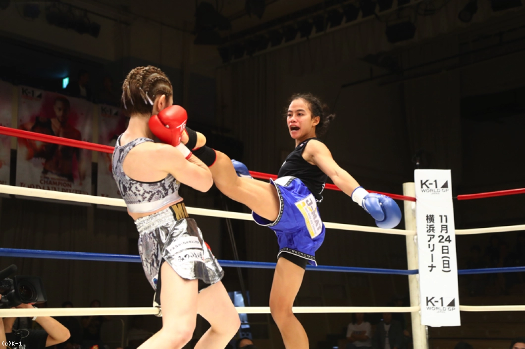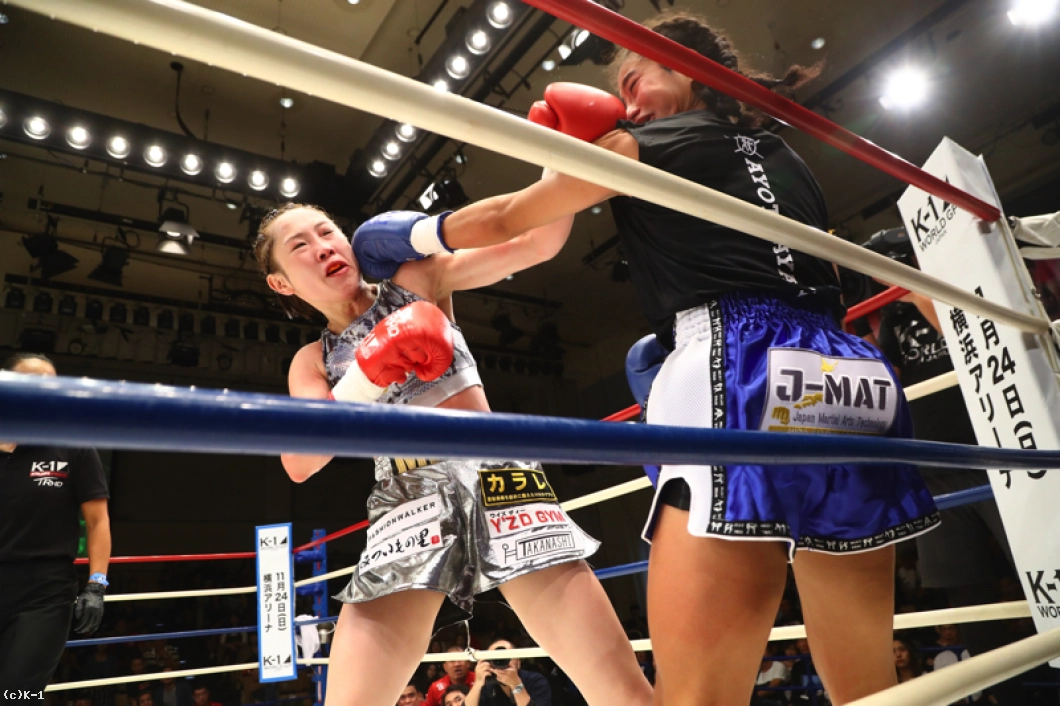 (判定を待っているときの気持ちは?)正直、ドローであってほしいという思いでした。(延長になったときは?)前に出るしかないと思いました。いまここで負けたらまたイチからのスタートになってしまうので。戦績を残している勝てばその先が見えると思い、気持ちだけで戦いました。(もしK-1で女子トーナメントが開催されれば興味はある?)いまの戦いかたで階級をあげるのは厳しいですが、練習次第だと思うので、チャンスがあれば出たいと思います。(今後の目標は?)強い相手を倒していける武器を磨いて、倒せる選手になっていきたいです」