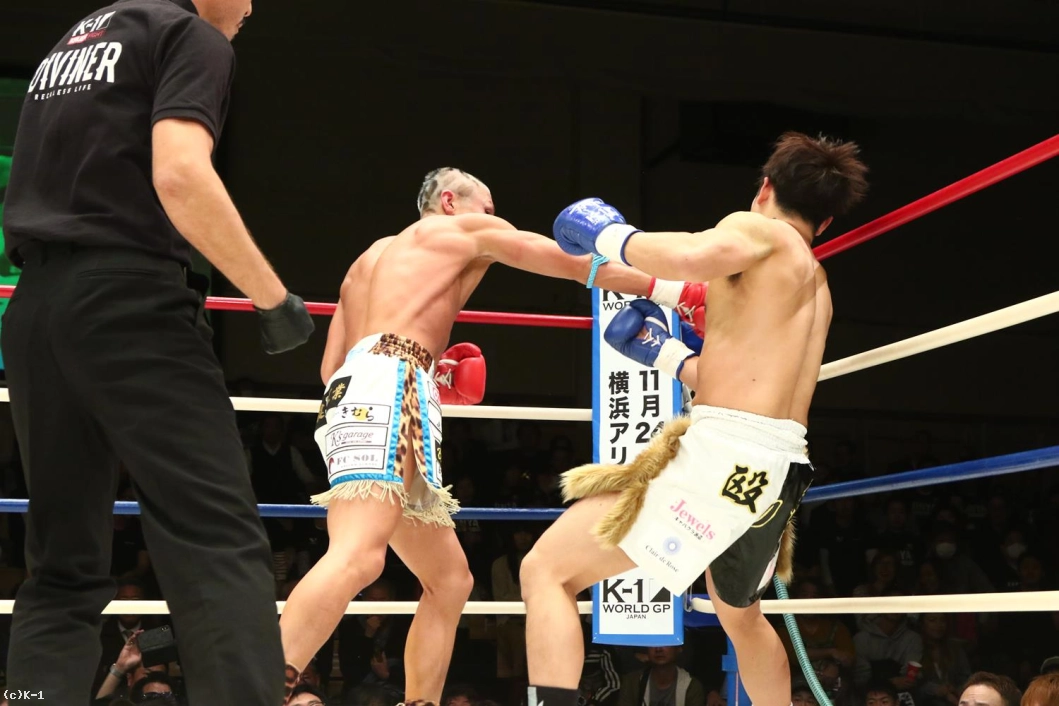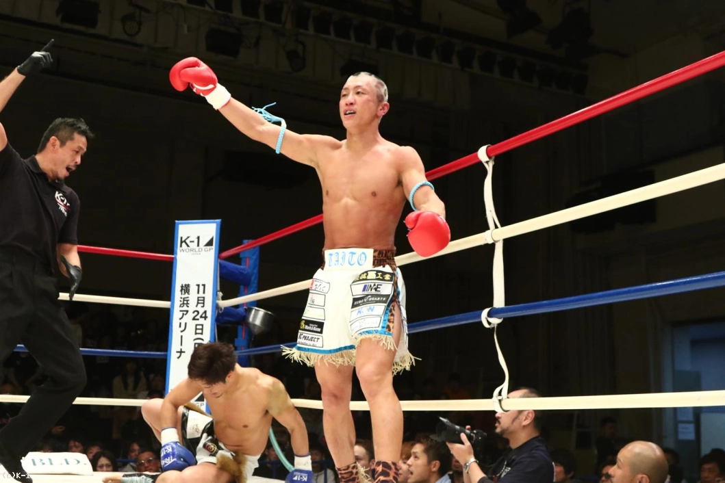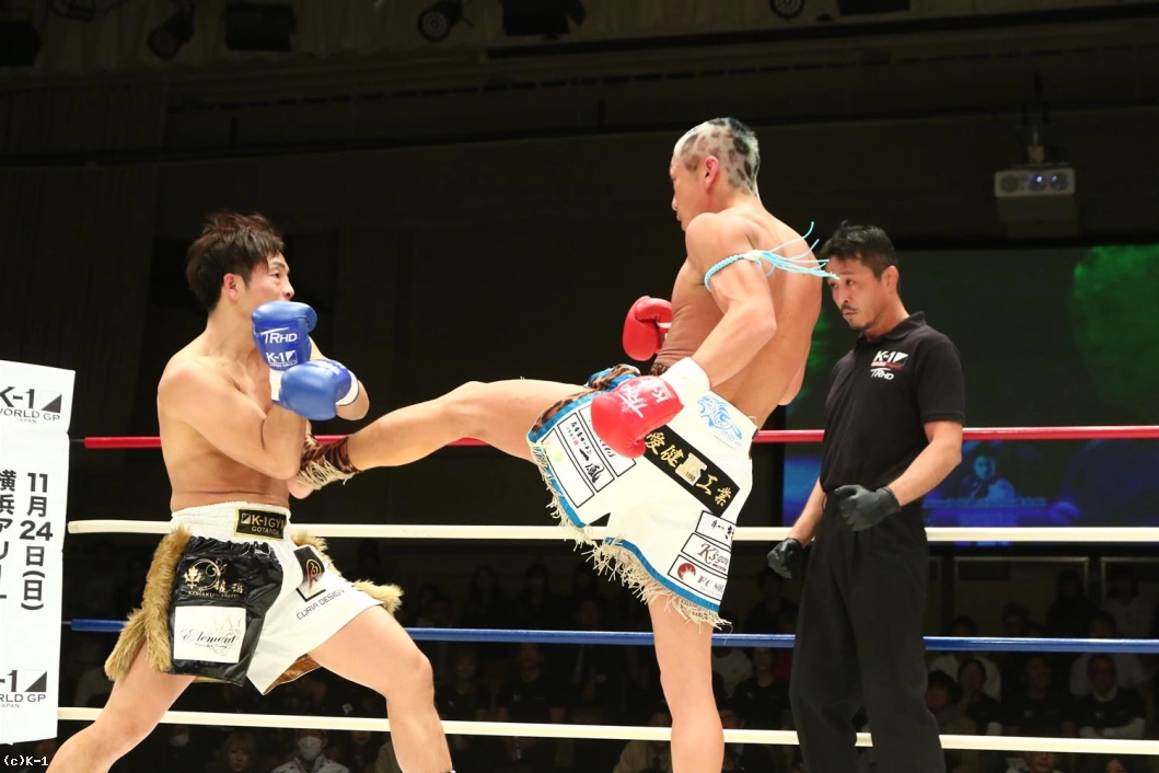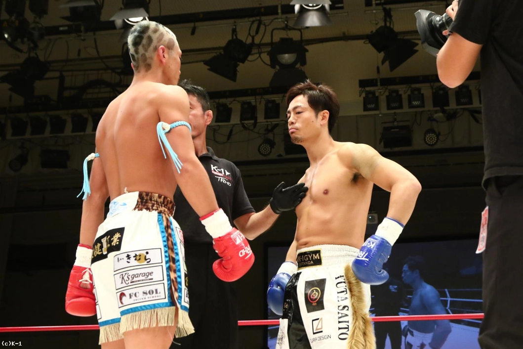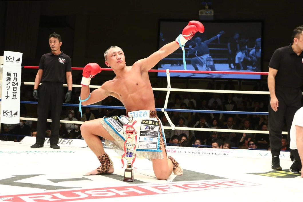 そして左ボディフックをめり込ませると斉藤はたまらずダウン。立ち上がった斉藤に泰斗は攻め手を緩めず、右クロスでダウンを追加。さらに泰斗は右ハイキックから右ストレートを当て、このラウンド3度目のダウンを奪って斉藤をKO。実にK-1 JAPAN GROUPでは実に3年10カ月ぶりの勝利を収めた。
