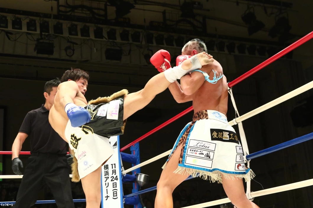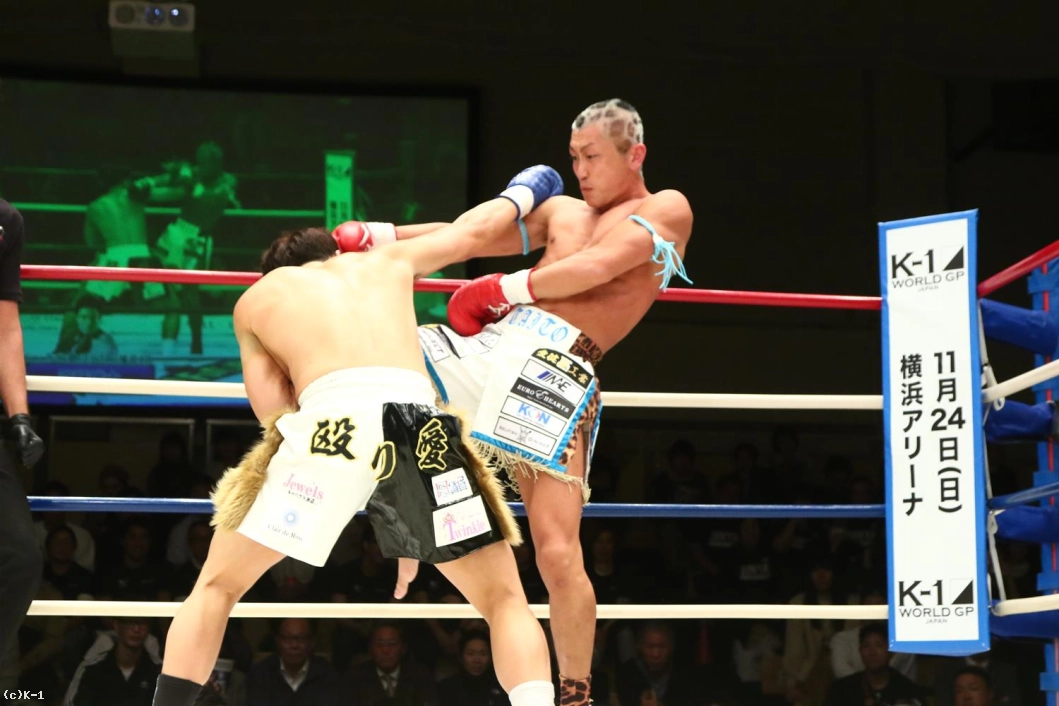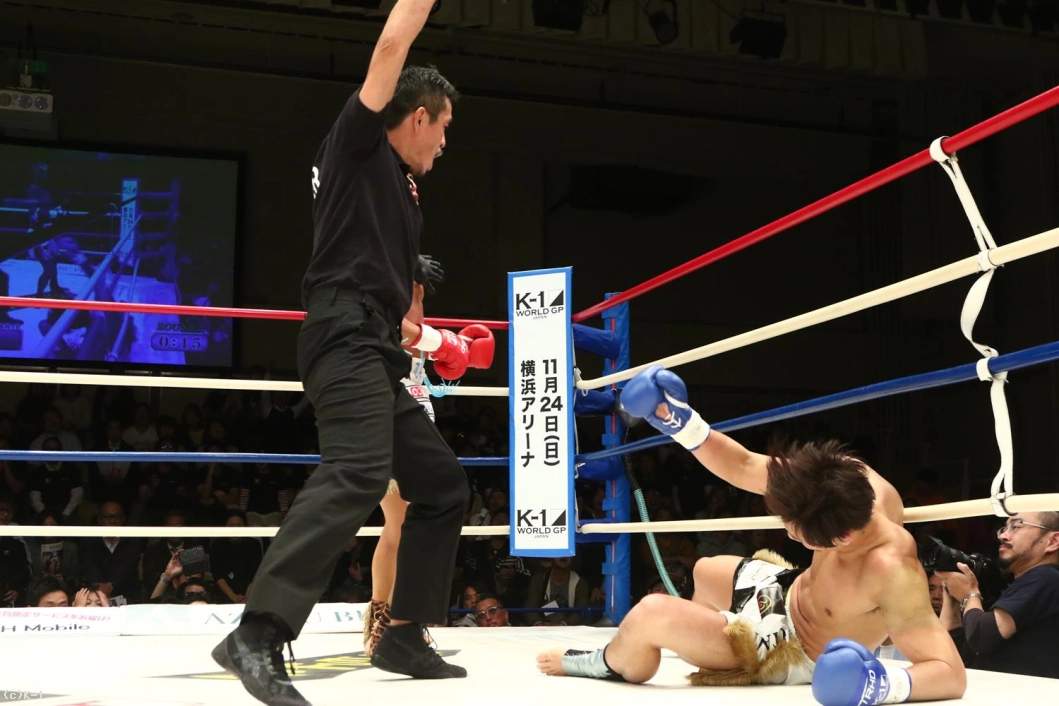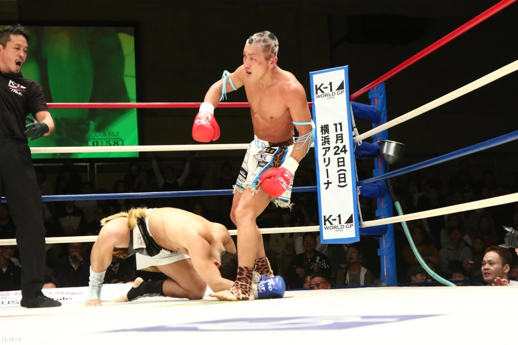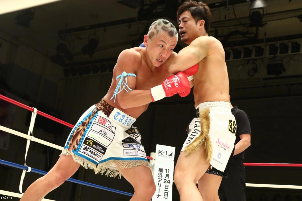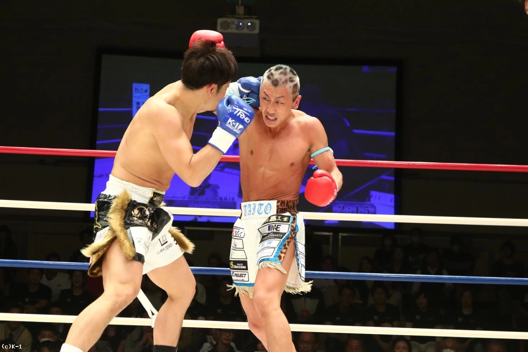 そして左ボディフックをめり込ませると斉藤はたまらずダウン。立ち上がった斉藤に泰斗は攻め手を緩めず、右クロスでダウンを追加。さらに泰斗は右ハイキックから右ストレートを当て、このラウンド3度目のダウンを奪って斉藤をKO。実にK-1 JAPAN GROUPでは実に3年10カ月ぶりの勝利を収めた。