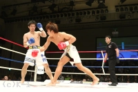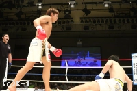2R、蓮實は両手を低めにしてリラックスした構えから再び強打を狙っていく。関川は右ローを蹴りつけるが、蓮實はボディフックから顔への右フック。蓮實は強打の連打を止めず、右ストレートから右フックを繋ぎ、関川をガードごとなぎ倒して2度目のダウンを奪う。立ち上がる関川だが、挽回には至らず2Rが終わる。