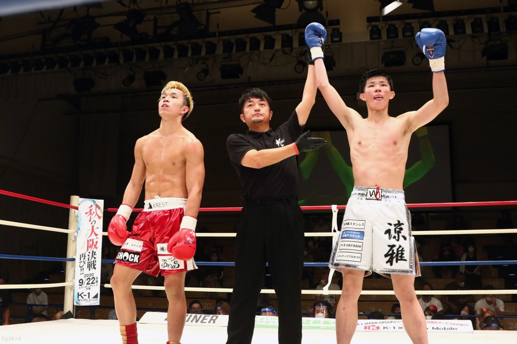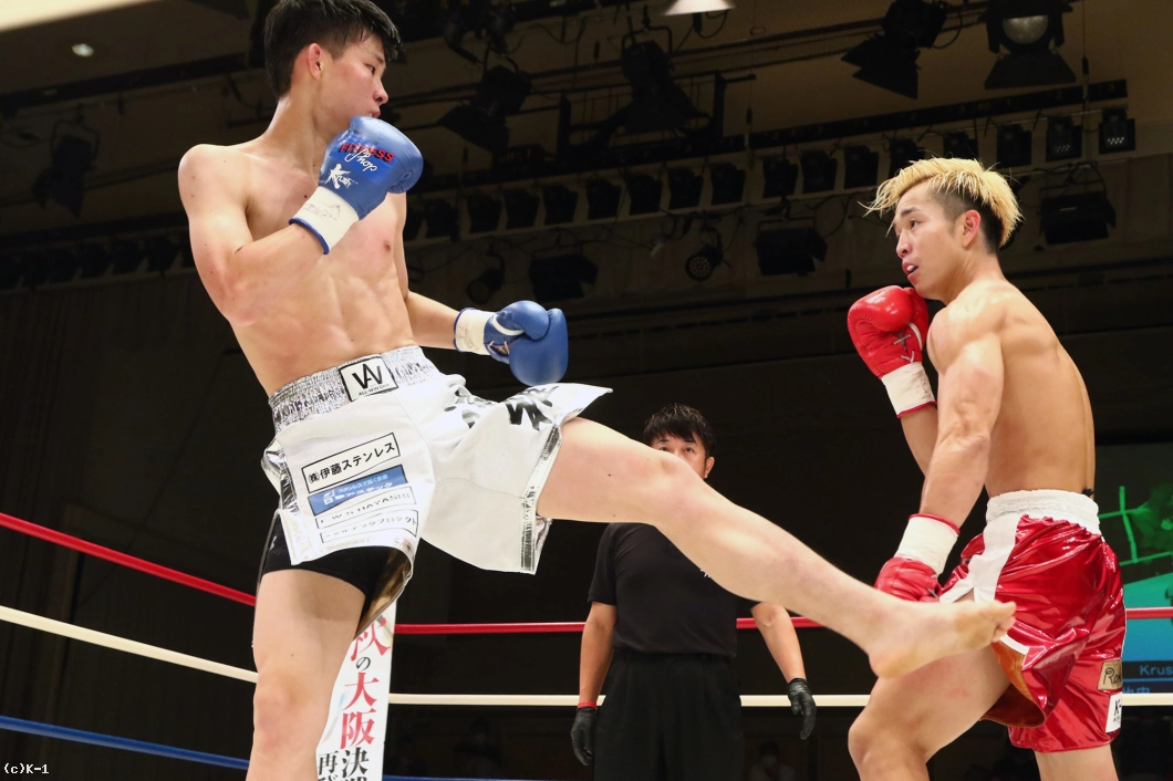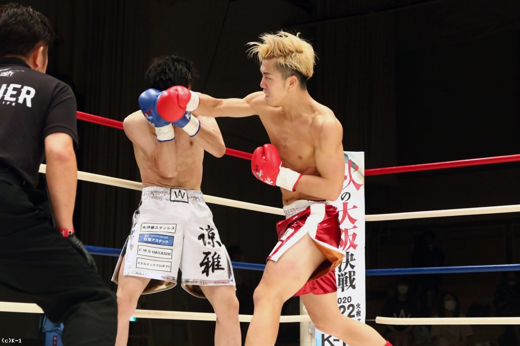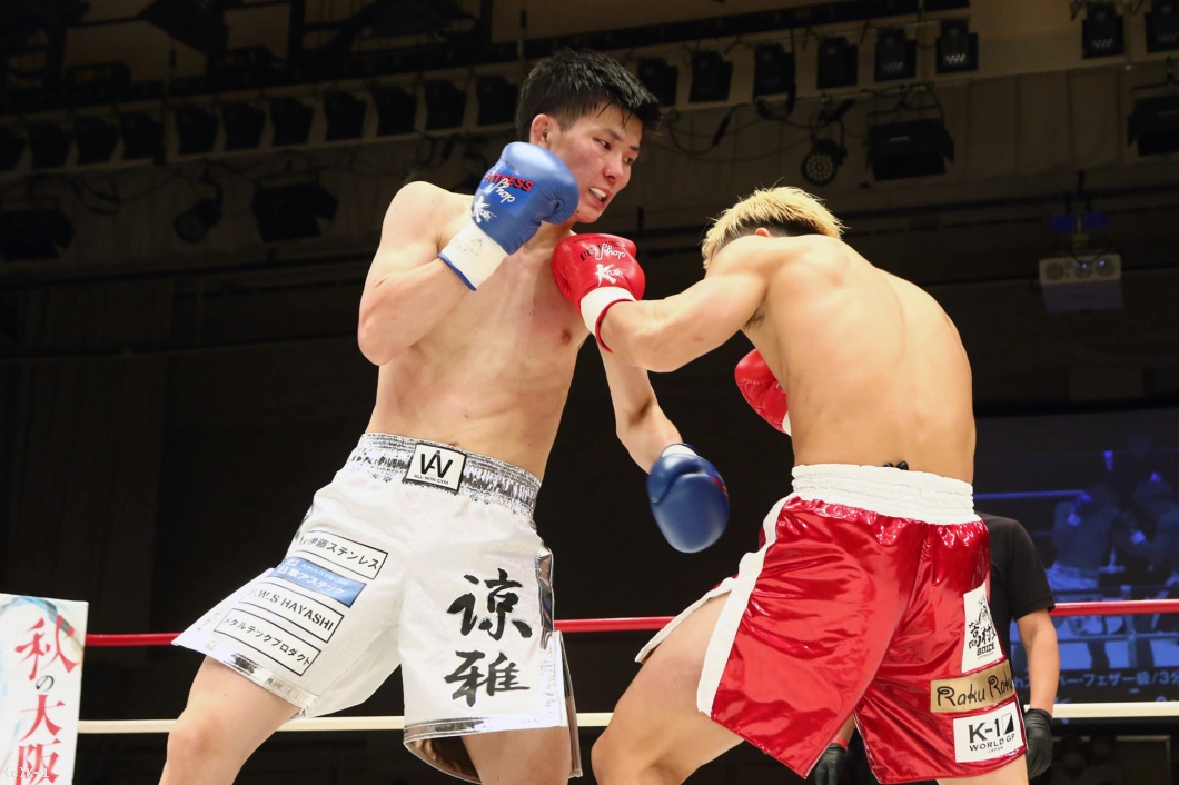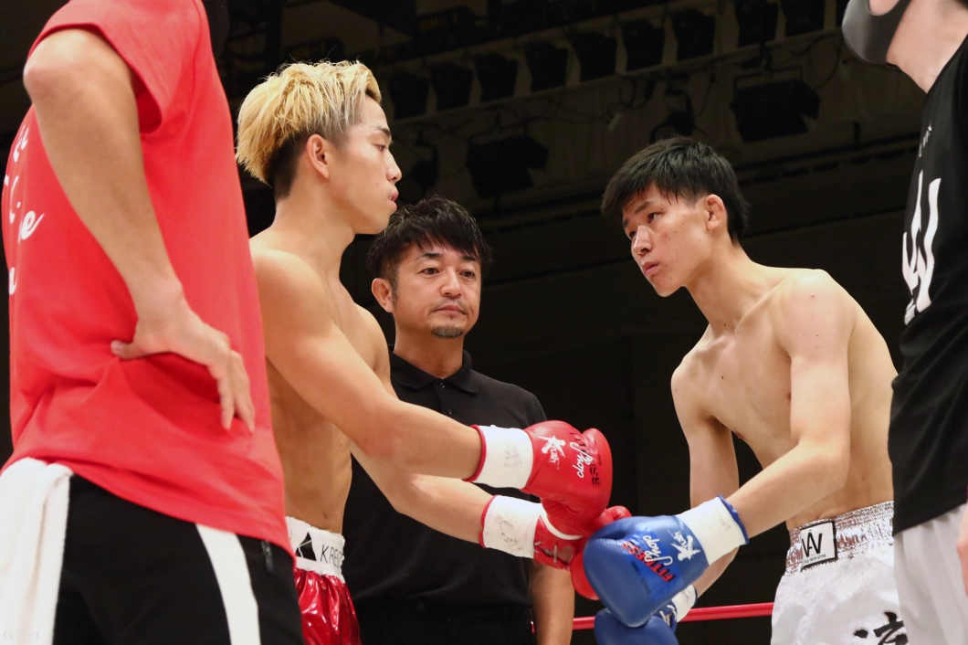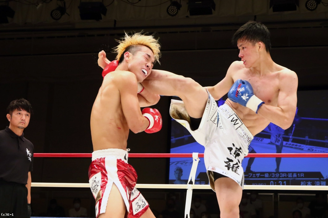 3R、松本は自ら下がって蹴りの距離を作り、左ミドルと右ローで西元をとらえる。パンチを回転させる西元だが、松本はやはりこの打ち終わりに右ストレートを返し、西元を懐に入らせない。左ハイキック、三日月気味の左ミドル、右ローととらえる松本。西元も強打を振るうが、クリーンヒットは得られず終える。判定は30−29、30−29、29−28の3−0で松本。パンチの西元に対し、松本が蹴りを活かして勝利した。