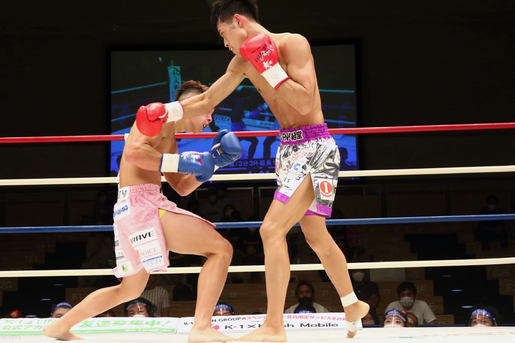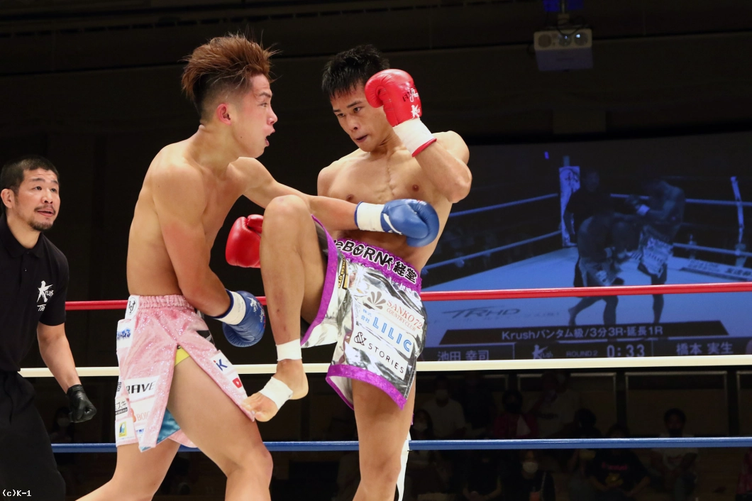 1R、池田はオーソドックス、橋本はサウスポーで互いにロー、ミドルを蹴り合う。170cmと上背のある池田はミドルを放っていくが、橋本は動ぜず、左ボディストレート、右フックと力のこもったパンチを振るっていく。池田もガードを高く上げてこのパンチをブロックし、ミドルと接近してのヒザ蹴りで攻める。