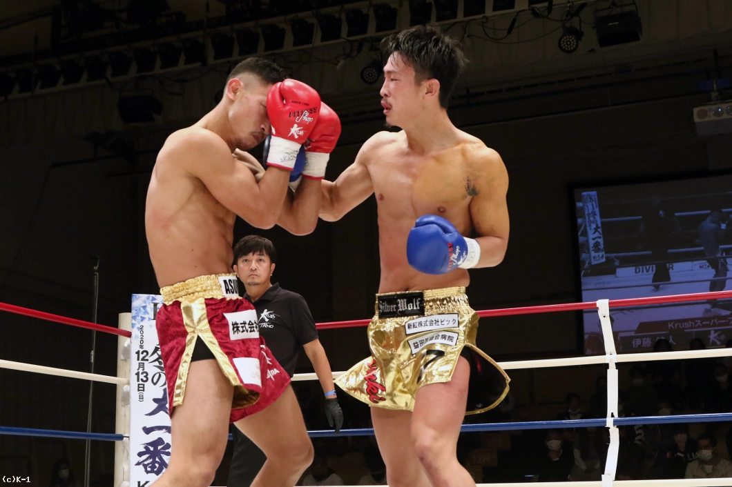 3R、安達は前に出て圧力で伊藤の間合いを潰し、ロー、跳びヒザ、ジャブと攻撃を上下に散らす。そして右クロス、左ボディフックと伊藤に決める。安達が攻勢となってくるが、伊藤は左ミドルを受けた直後に返した右フックでダウンを奪取。さらに攻めて右クロスを当てて終える。判定は30−28、30−28、30−28の3−0で伊藤。最終3Rに奪ったダウンで勝利をものにした。