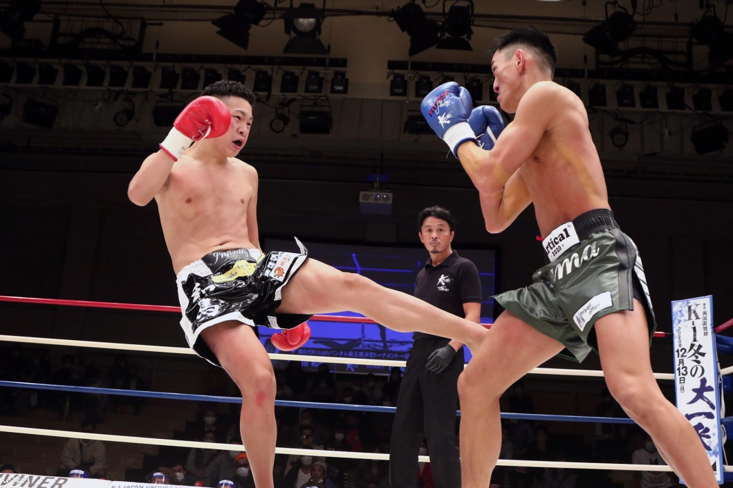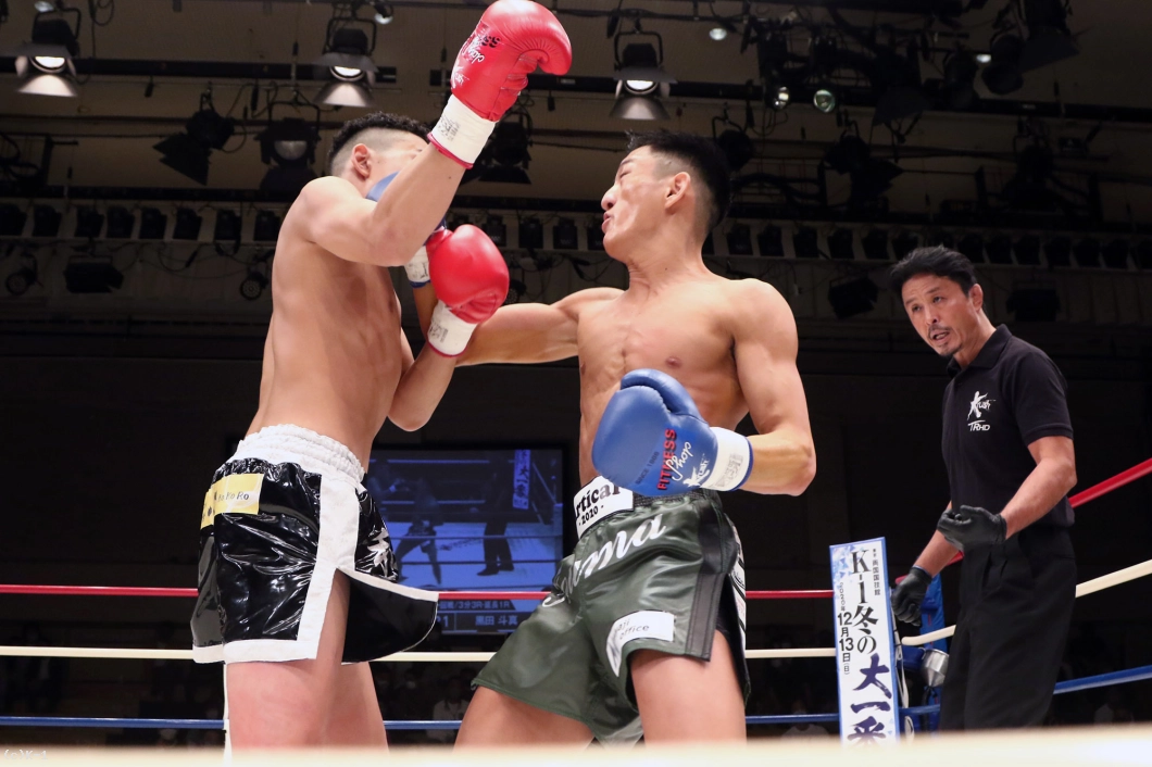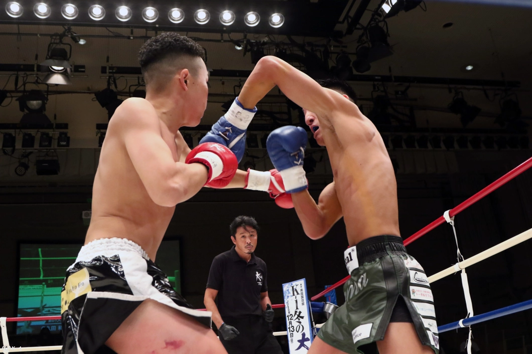 2R、距離を取る黒田に多久田は左ローを当てていく。黒田がミドルからジャンプしての回転蹴りを見舞えば、多久田は後ろ回し蹴りを返す。黒田はロングレンジの蹴りに惑わされず左フック、左ボディストレートをヒット。蹴りを主体に進める多久田だが、終盤左フックを当てる。だが黒田も左フックを当て返して終える。