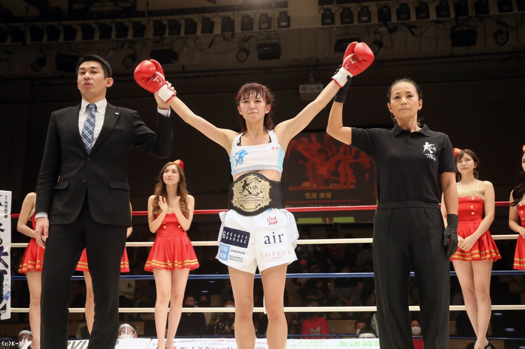 3R、攻め入らんとするMOEだが、菅原は前蹴りで突き放す。MOEのローに前蹴りを合わせ尻餅をつかせる場面も。菅原はリーチを活かして左右ストレートを当てていく。鼻血の見られるMOE。菅原はMOEの蹴りを空振りさせ、自身の前蹴りを当てて終える。判定は30-29、30-29、30-28の3-0で菅原。先輩でセコンドにもついたKANAとの約束を果たし王者となった。