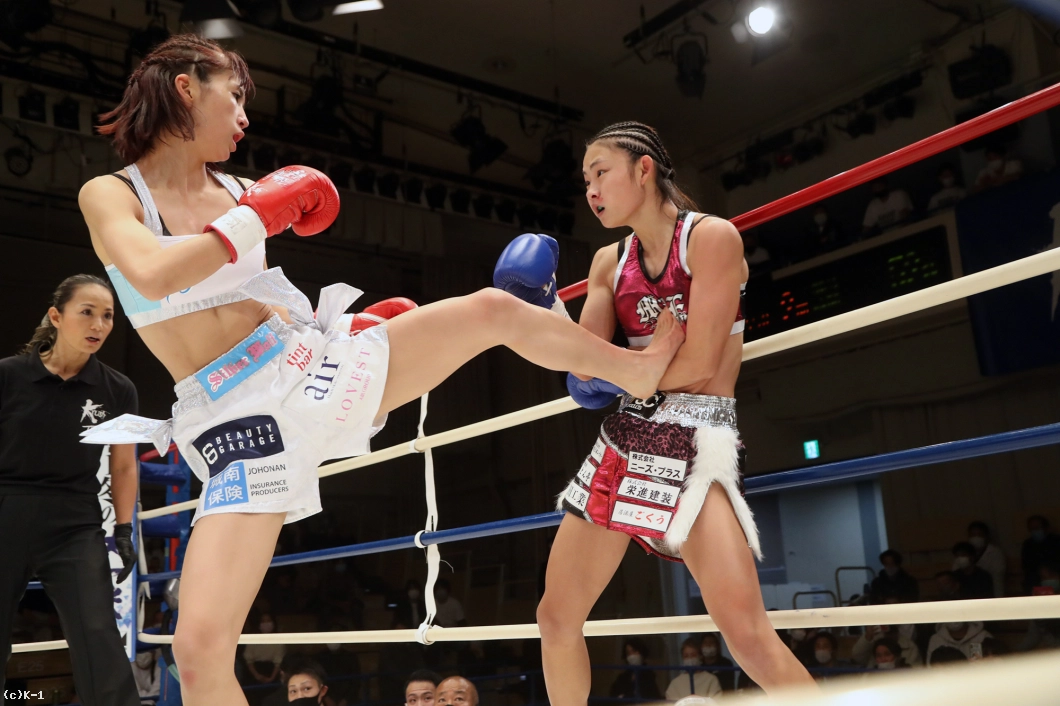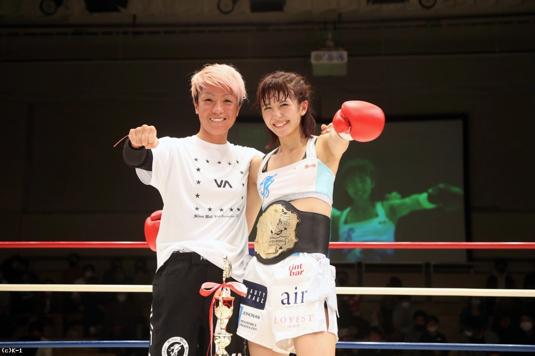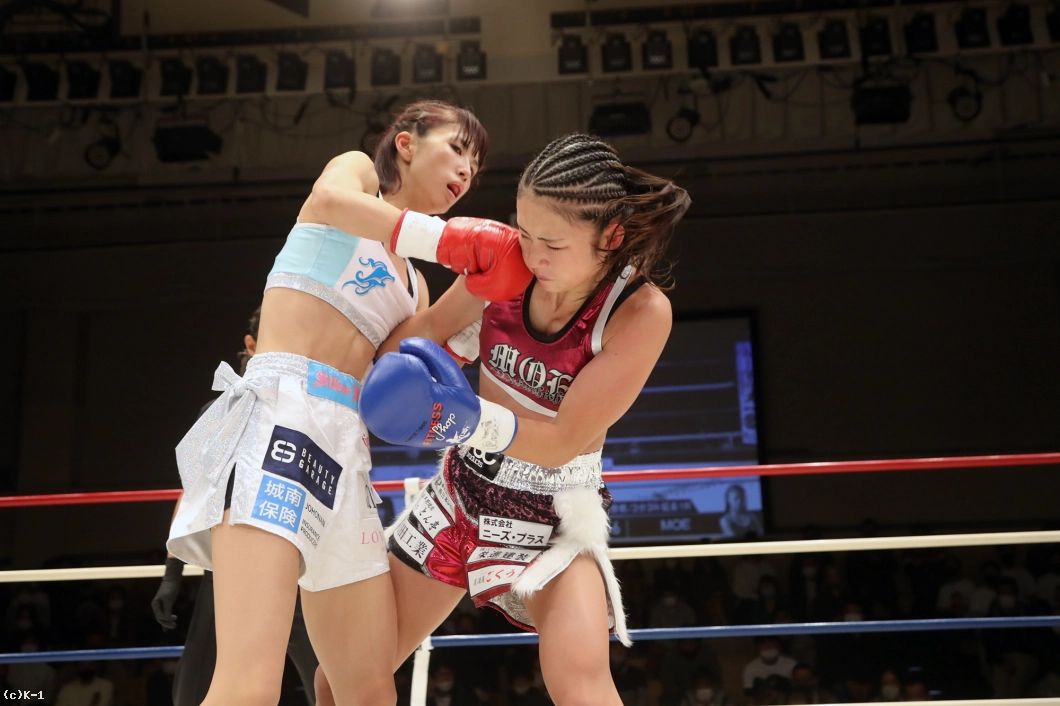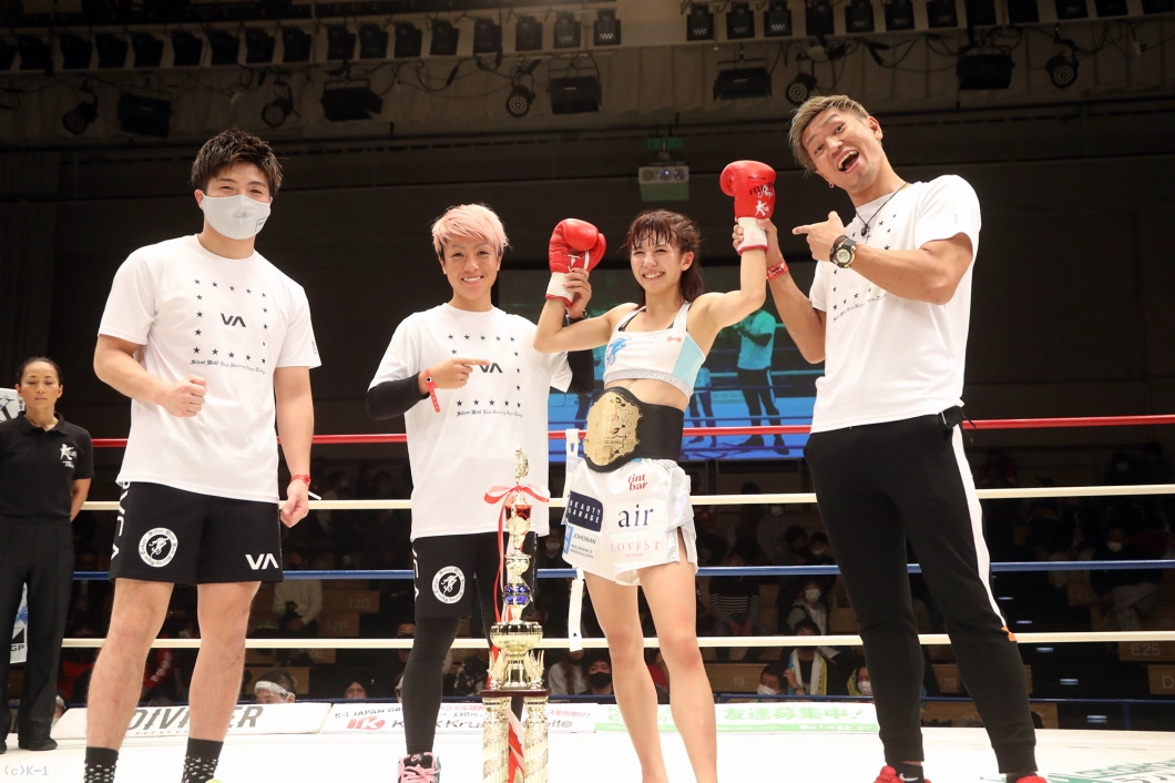 「とりあえず勝ててよかったなっていう気持ちです。MOE選手はもっと来るかなと思っていたので、もっと攻め切れたらよかったなとか反省はあります。(試合そのものを振り返って)とりあえずプレッシャーを掛けて、向こうがどういう反応をしてくるか見ていたんですけど、思ったより何もしてこなくて、そういう面ではやりやすかったです。やっと自分のリーチを活かした戦いができたのかなと思って、バッティングを気をつけようと思っていたんですけど、特に3Rはそれで頭を引いて手だけ出していたら“自分のパンチは当たるけど向こうのパンチは当たらないんだ”と思って。新たな発見がありました。(MOEが)鼻血が出ていて、セコンドの方々にも『パンチ当たってるよ』って聞いていたので、右ストレートは練習していたしよかったなぁって。(ベルトを巻いて)負けたくないっていうのが大きかったので、嬉しいですけど試合が終わった解放感っていうか、何も考えられなかったです(笑)。(試合後にKANAとハイタッチをして)夢が叶ったんだなぁみたいな。嬉しかったです。まだまだ見るからに弱そうなので、もっと堂々といれるような、KANAさんみたいなカッコいいチャンピオンになりたいです」