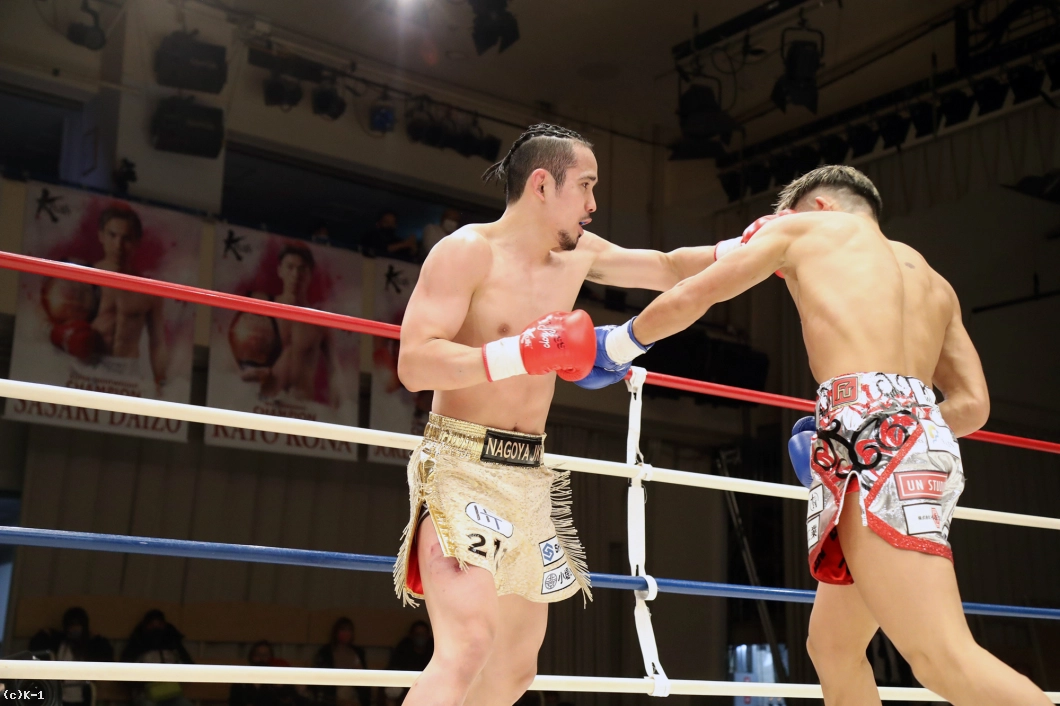 2R、斗麗の前蹴り、ローを浴びても新美は前に出て左ストレート、右フックを打ち込む。斗麗は再びのカーフキック、そして新美を押しての左ストレート・右アッパーと打っていくが、なおも新美は下がらずに出て、斗麗のスタミナを削って口を開かせる。斗麗は前蹴りをうるさく繰り出し、新美にプレッシャー掛けさせない。