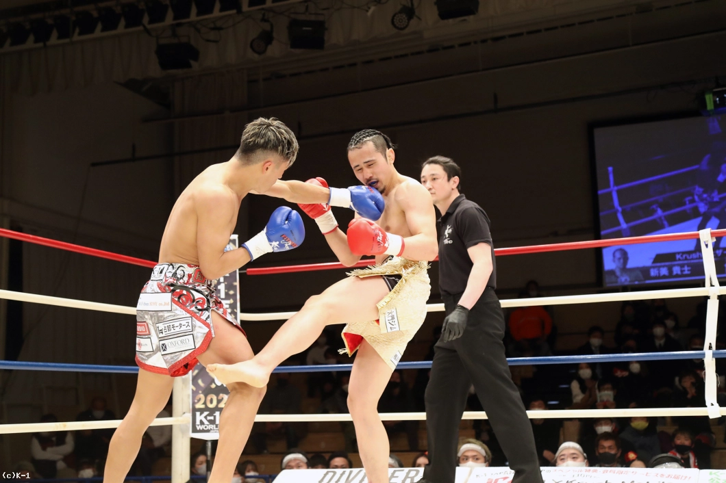 3R、斗麗は逆に前へ出る。跳びヒザを繰り出すが、新美はクリーンヒットさせず、効いてないぞと首を振る。新美は斗麗のプッシングを受けてもすぐ前に戻り、左ローを連続で当てる。斗麗は左ローが効いてきて、バランスを崩しスリップダウン。そして跳びヒザを繰り出すが、新美はそこに左フックを合わせダウンを取る。立ち上がるも呆然とした表情の斗麗。新美はさらに左ロー、左ストレート。斗麗もしかし左フックの強振を連打して向かっていく。だが、新美は大きなダメージを見せず下がらされてもすぐ前に出返す。