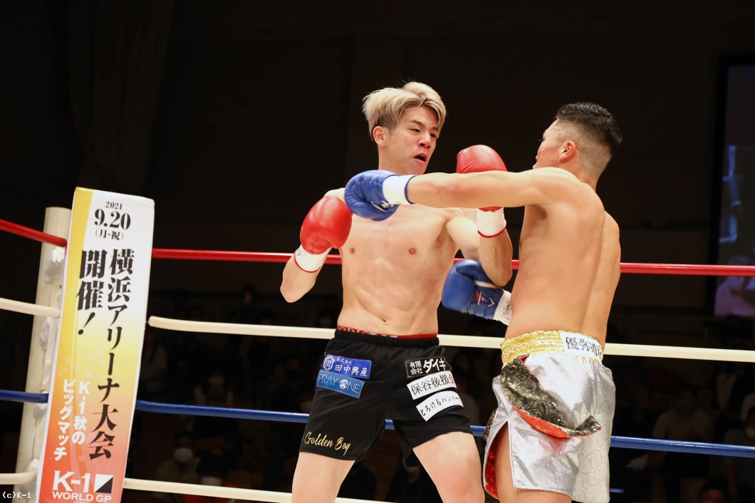「こういうコロナ禍の状況の中、本当にありがとうございます。僕はたくさんの人に支えられて格闘ができていて、関わってくださる家族、スポンサー、ジム関係者のみなさんありがとうございます。もっともっと強くなっててドンドン勝っていけるよう頑張ります。K-1福岡大会にジムの先輩山本直樹選手が出るので応援よろしくお願いします」