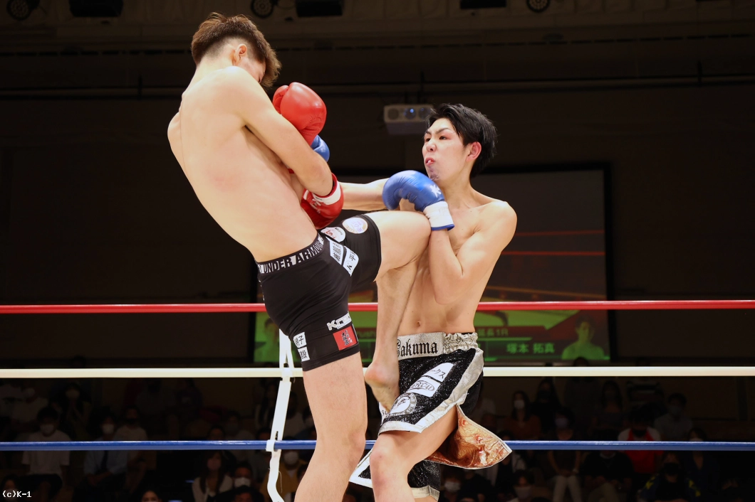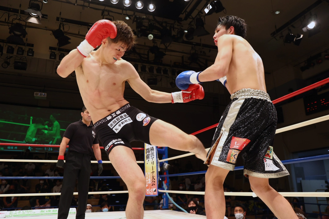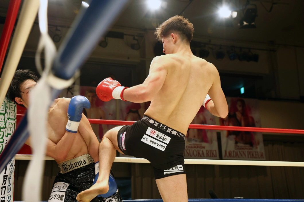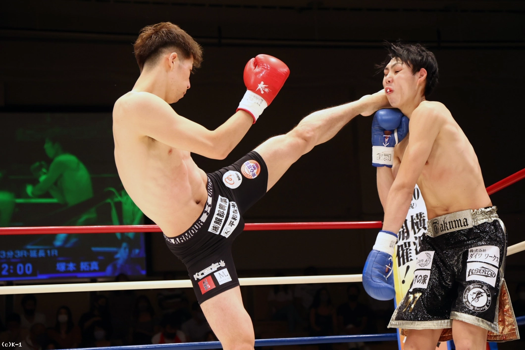 2R、稲垣はオーソドックスからカーフキックを見舞い、続けて右ストレート。塚本は右ミドルで稲垣を遠ざけんとする。稲垣はこの攻撃を警戒しながら右ローを当てていく。そして終盤は左ストレートを塚本に突き刺し終える。