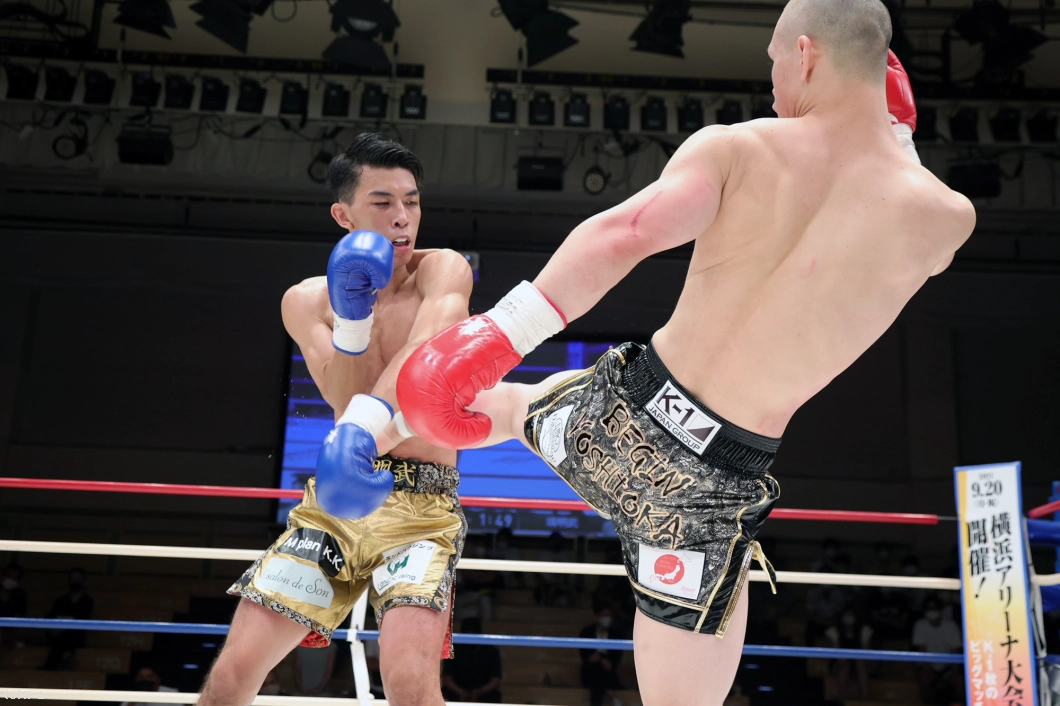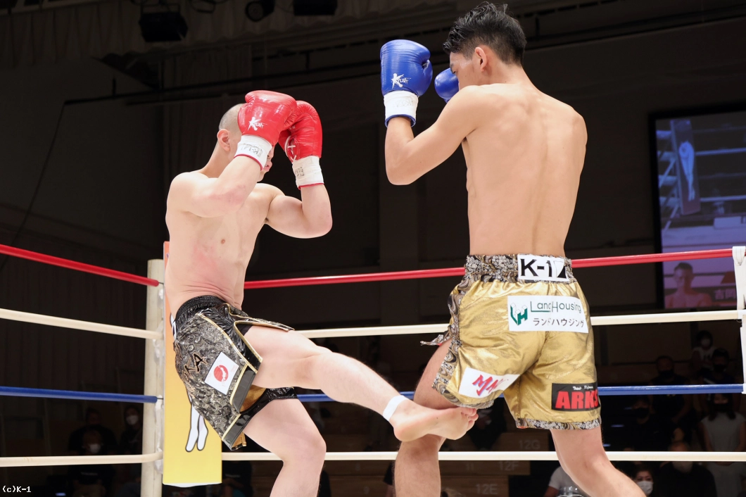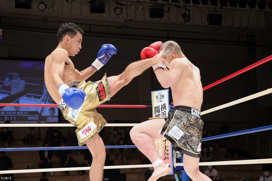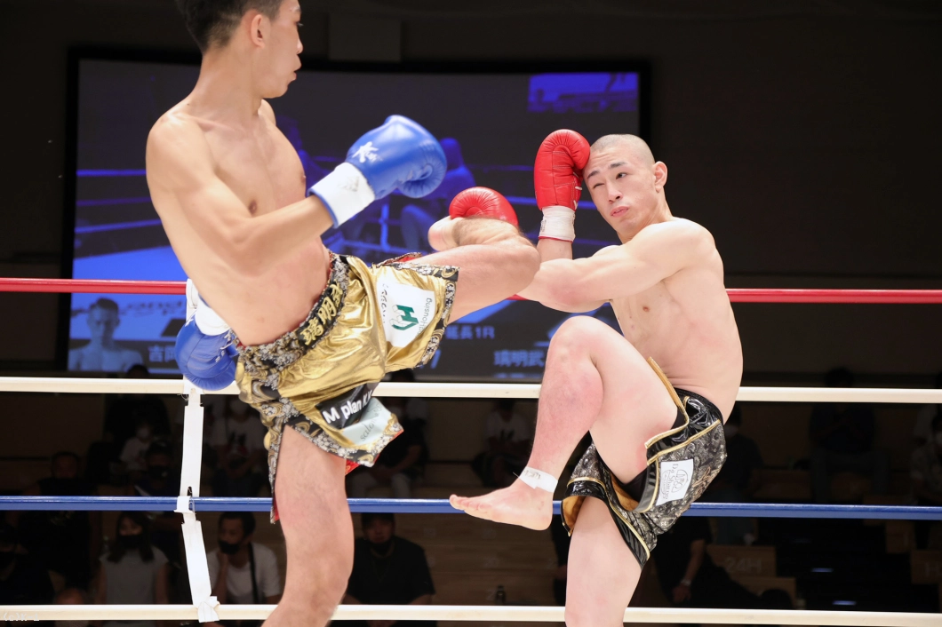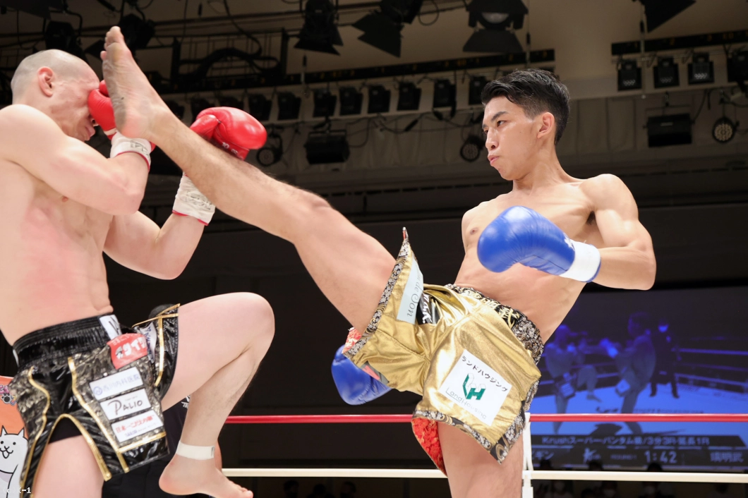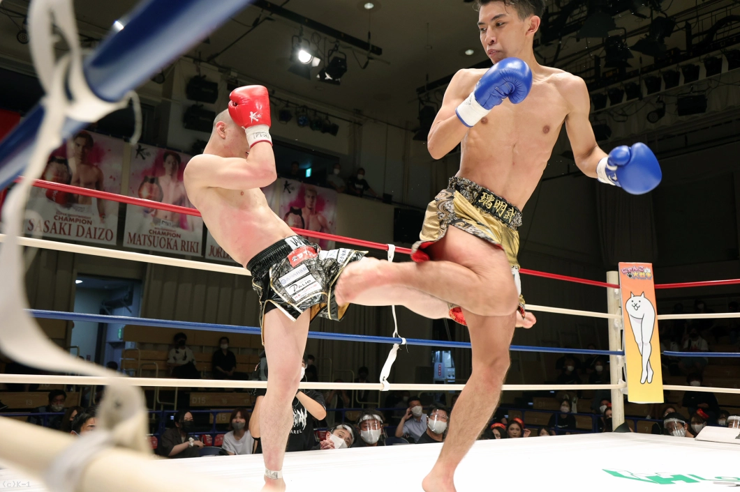 1R、璃明武は右ローを連続で当てていく。カーフキック(膝から下・ふくらはぎを蹴るローキック)も織り交ぜるが、吉岡も右ローを返す。右ローを多用する璃明武に吉岡は右ストレートを合わせるが璃明武はブロック。璃明武はさらにカーフを当てる。