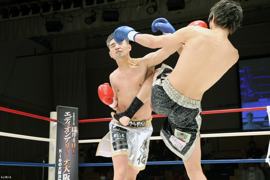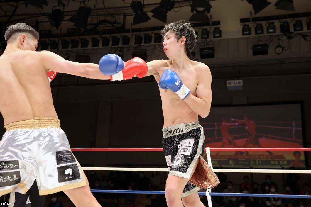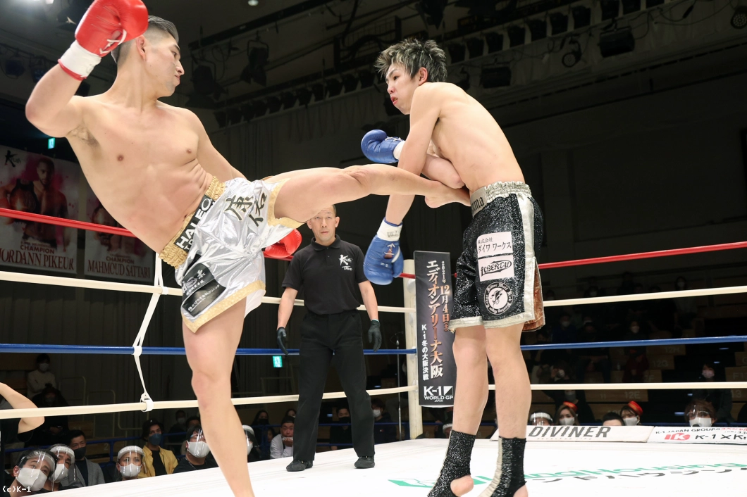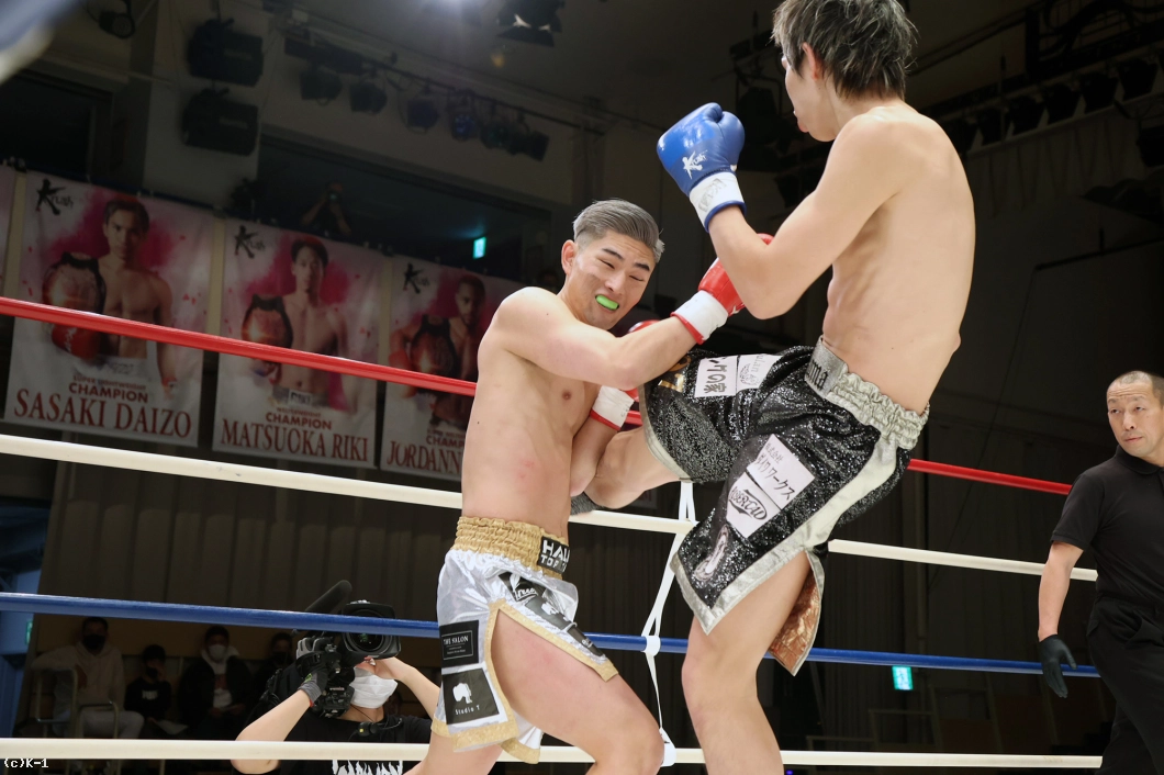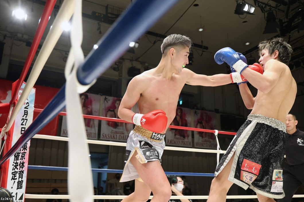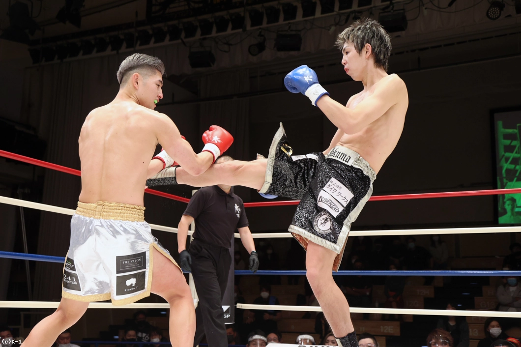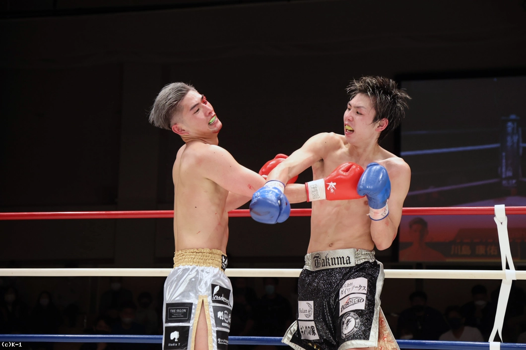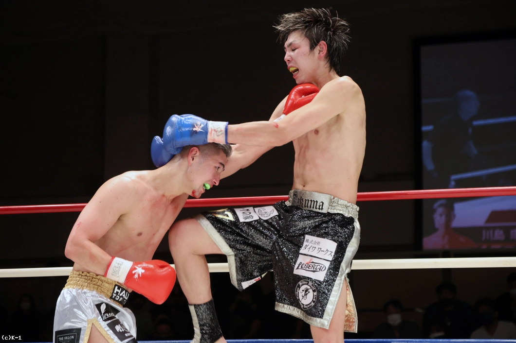 延長R、両者リング中央でワンツーを交換。塚本がプレッシャーをかけ、至近距離でヒザを突き上げる。川島が左ストレートから右フックを上下に散らすと、打ち終わりに塚本が右ヒザ蹴りをボディへ。体ごと押し込む塚本は距離を詰め右ヒザ。ロープを背負った川島へ放った塚本の左フックで川島が左まぶたをカットする。ドクターチェックから再開後、まぶたから血を流しながら川島が左右フックで前進。塚本もパンチの打ち合いに応じる。下がる塚本を追う川島に、ヒザで迎え撃つ塚本。意地を見せ合う中試合終了のゴングが鳴り響いた。判定は3者とも塚本の勝利を支持。塚本が3連敗から脱出するうれしい勝利を手にした。