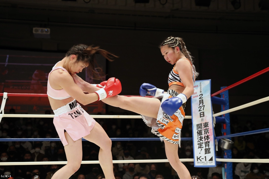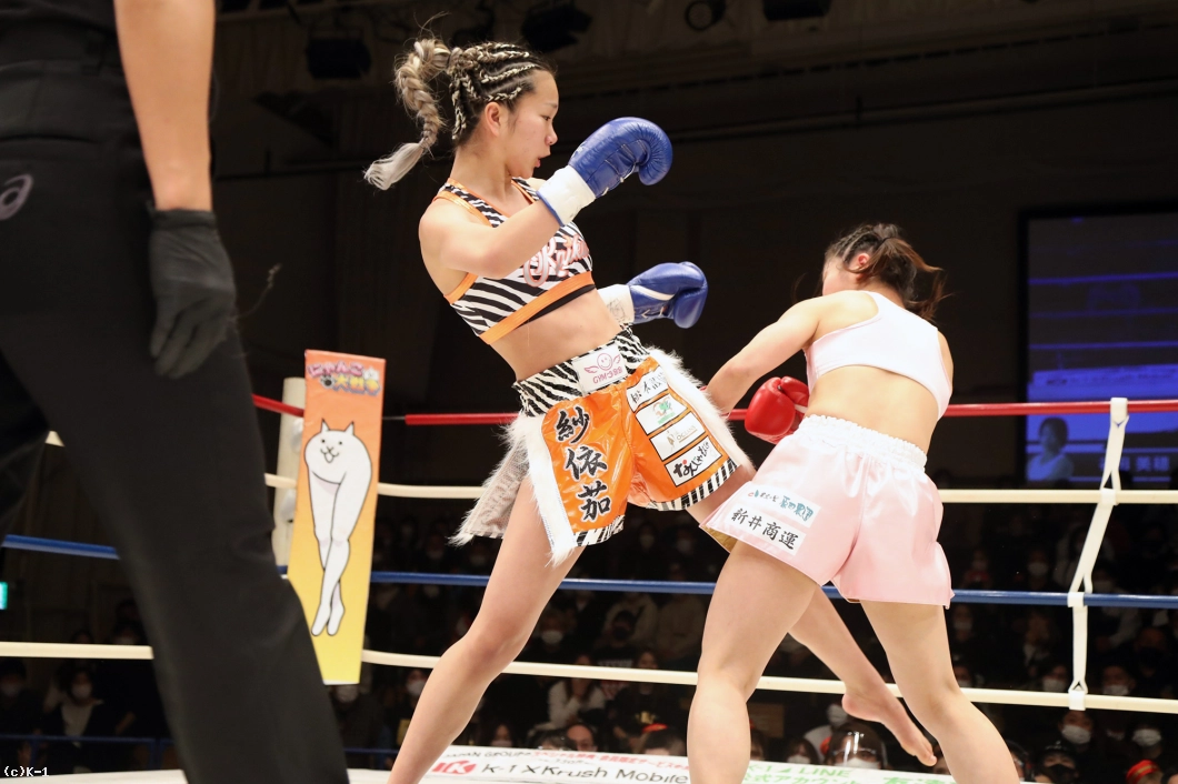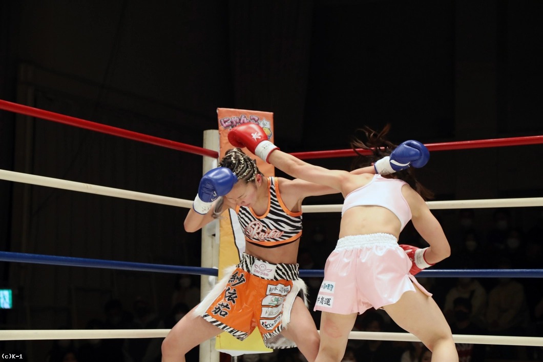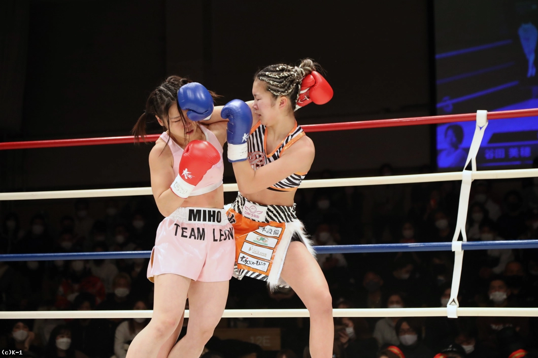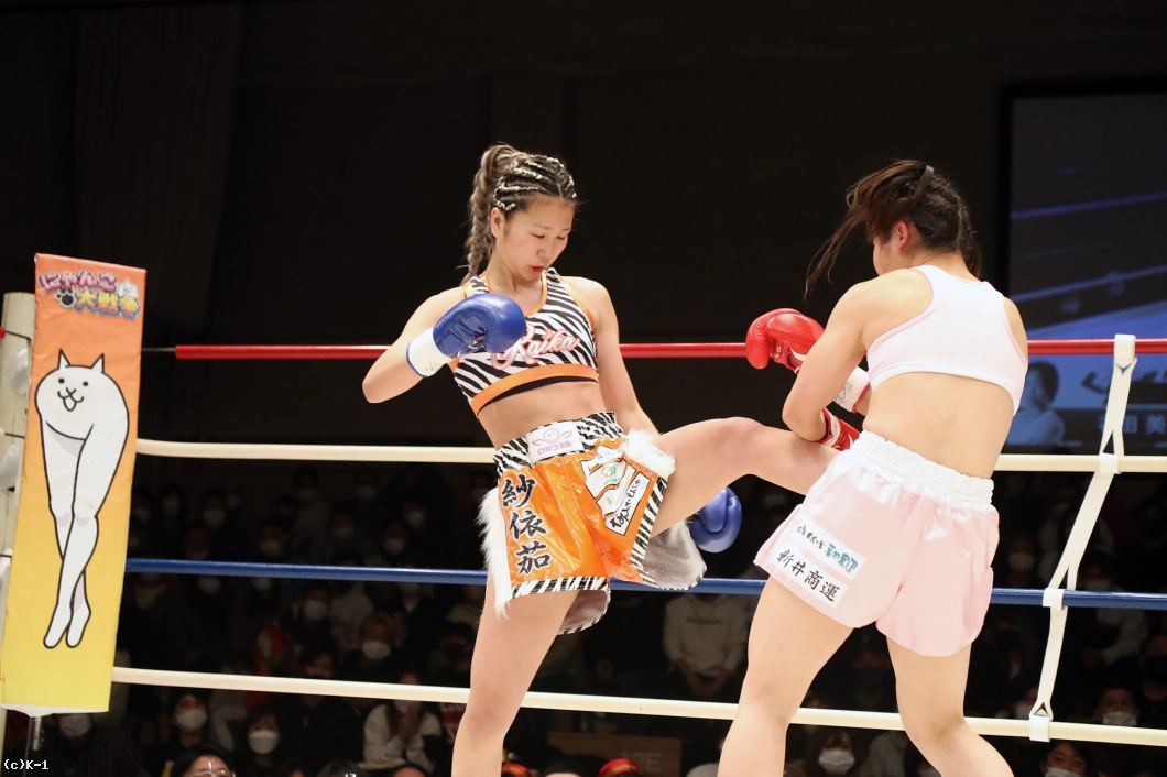 2R、紗依茄は前蹴り、カーフキックと谷田を懐に入れない。高い前蹴りも決め谷田をスリップダウンさせる。谷田も左右フックを振るって向かうが、紗依茄は月心会らしいステップワークで谷田のプレッシャーをかわす。前蹴りをかいくぐって前に出る谷田だが、紗依茄に組まれてしまう。