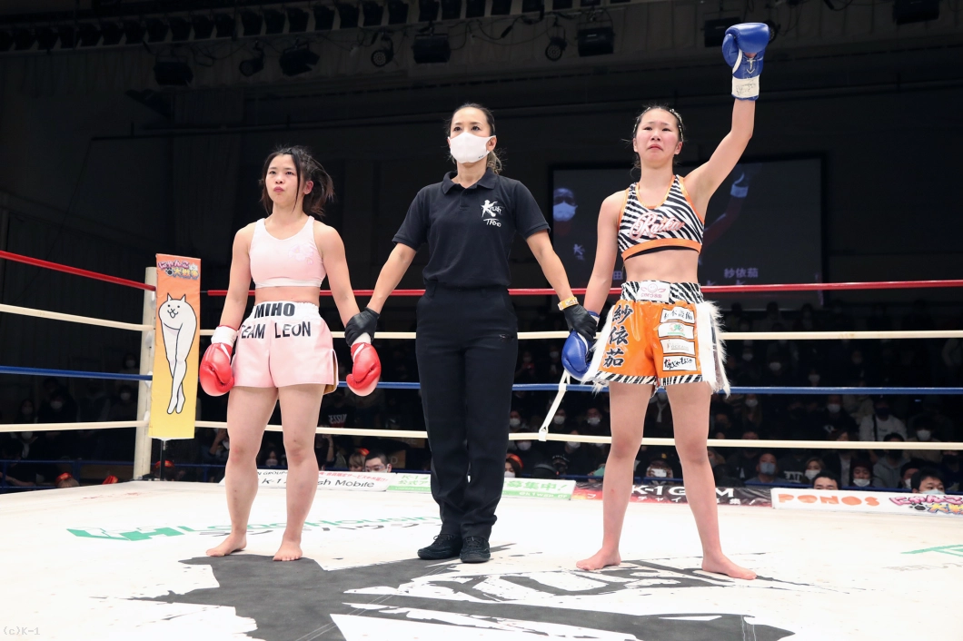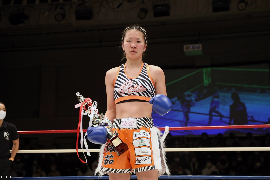 「今年一発目の試合で勝ててホッとしています。(対戦相手の印象は?)試合の11日前に相手が変わって対策とかうやりづらい部分もあったんですけど、道場の先輩や代表のおかげで3Rまで戦えたし、勝てたことにホッとしています。(今後の目標は?)今日みたいな試合やと上にはいけないので、もっと頑張ります。女子高生のうちにチャンピオンになります」