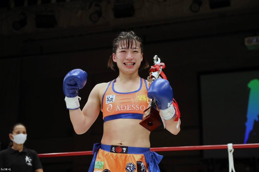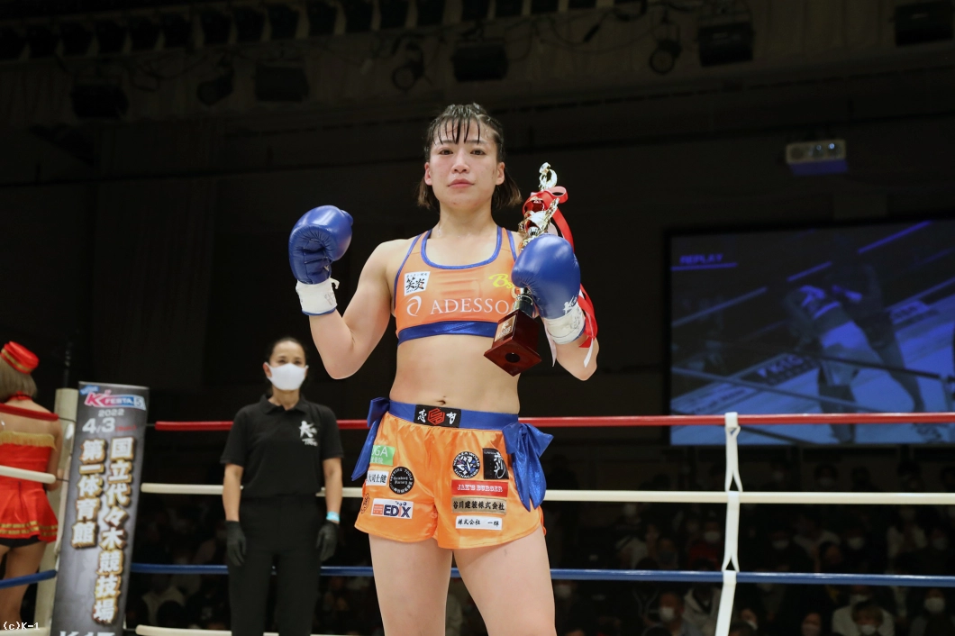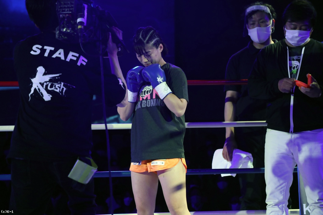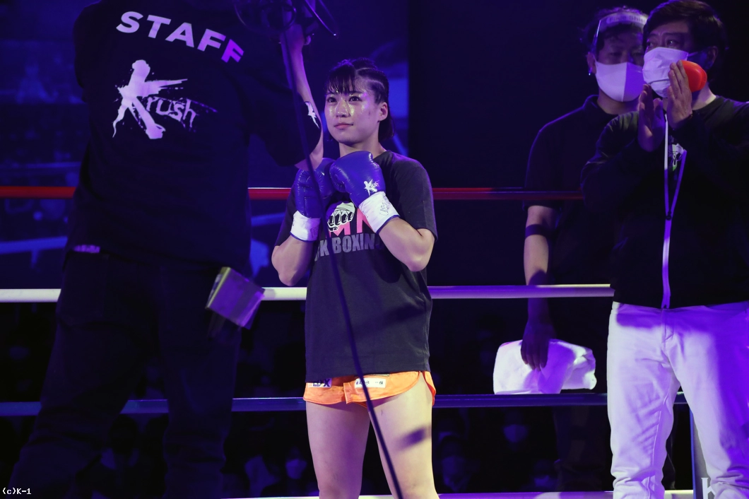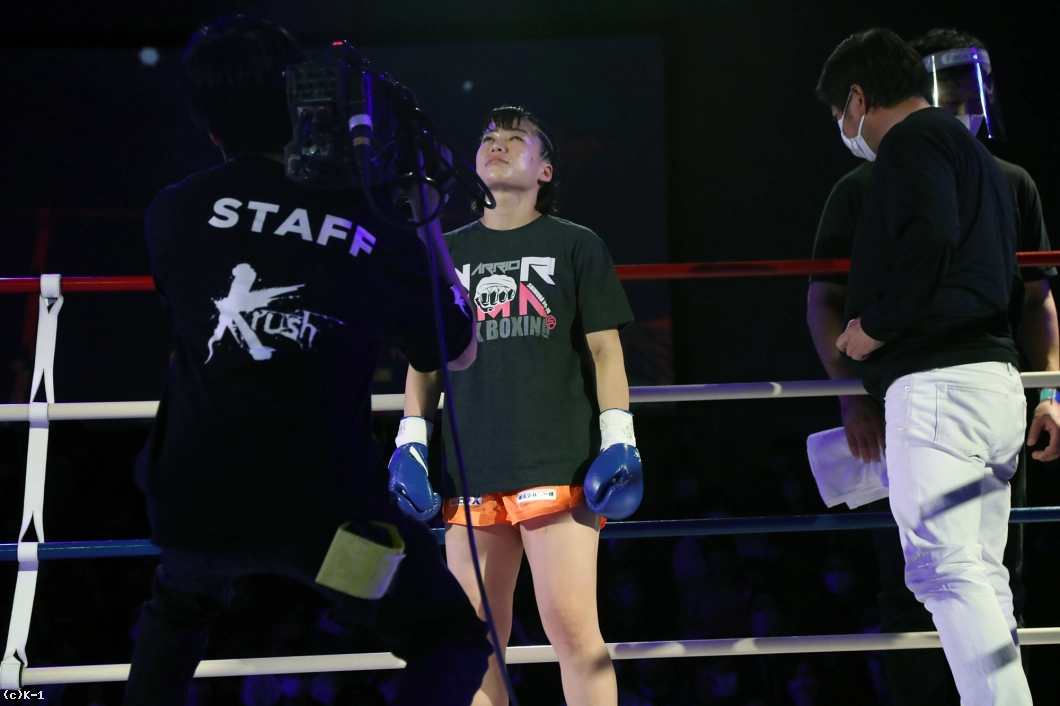 「すごい相手選手も強い気持ちだったので、乱暴な試合にはなってしまったんですけど、熱い試合ができたかなと思います。(対戦相手の印象は?)試合後に挨拶にいってきたんですけど、悔し涙を流していて。でも笑って応えてくれて良い選手だなと思いました。(Krushの印象は?)思っていた通りにレベルの高い選手も多くて面白い大会でした。(今後の目標は?)しっかり実力をつけて戦える選手に育つことと、6月のK-1女子大会に出て盛り上げていけたら良いなと思います」