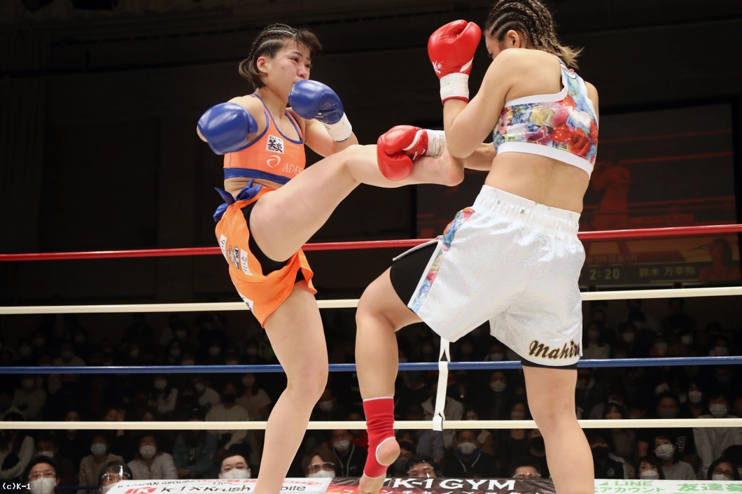 3R、両者打ち合いとなり、パンチでは鈴木が右フック・左フックと優勢だが、真優はセコンドの指示に従い距離をあけてミドルとローを当てていく。間合いを詰めてのパンチを狙う鈴木は、真優に距離を作らせず連打で攻めて押し終了する。判定は30-29、30-29、30-29の3-0で鈴木。Krush初参戦を白星で飾った。
