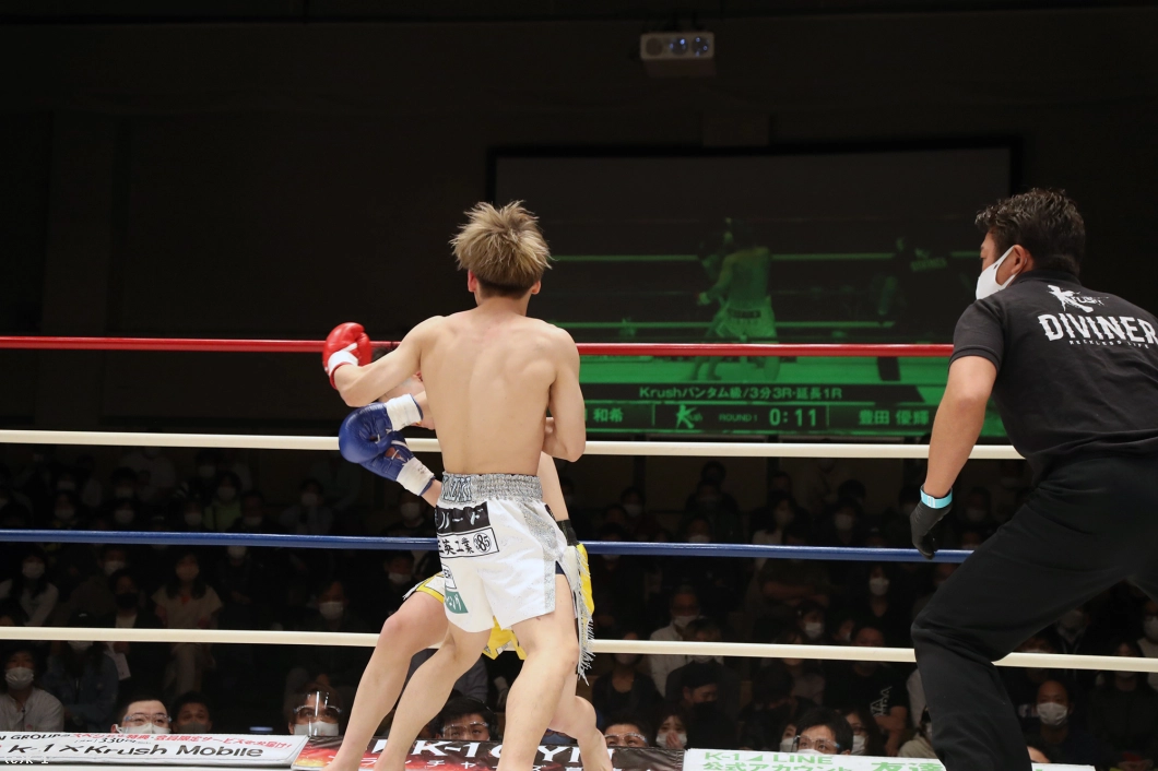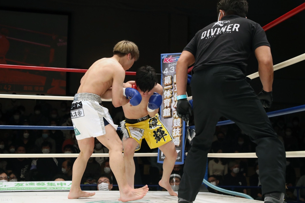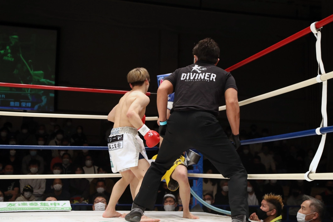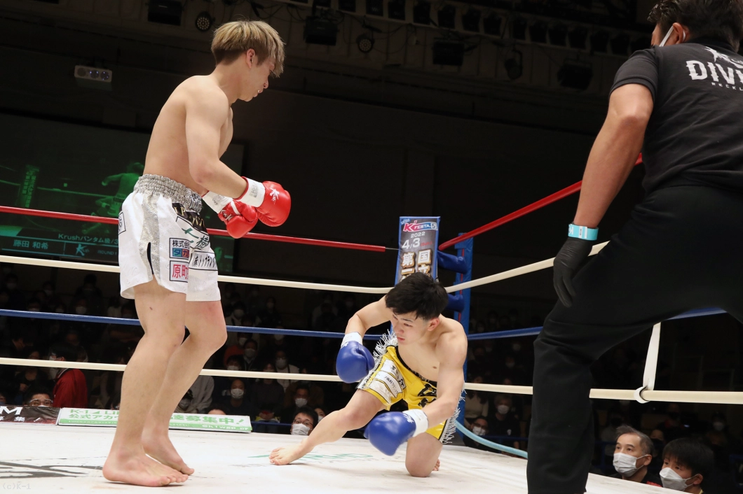 2R、右の三日月蹴りを入れた藤田は、そこから今度は右ストレートで豊田をダウンさせる。豊田は立ち上がるもダメージがあり、藤田は右フックで4度目のダウンを与えてフィニッシュした。