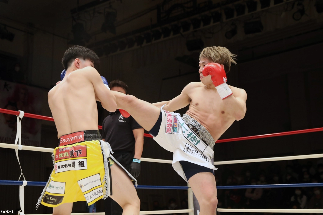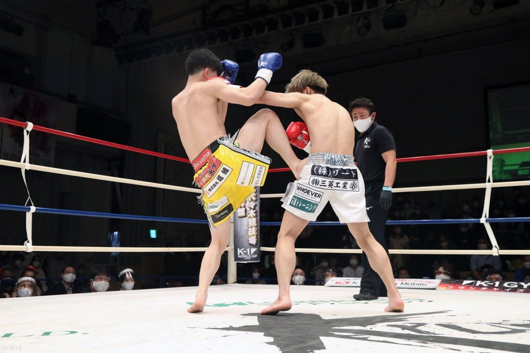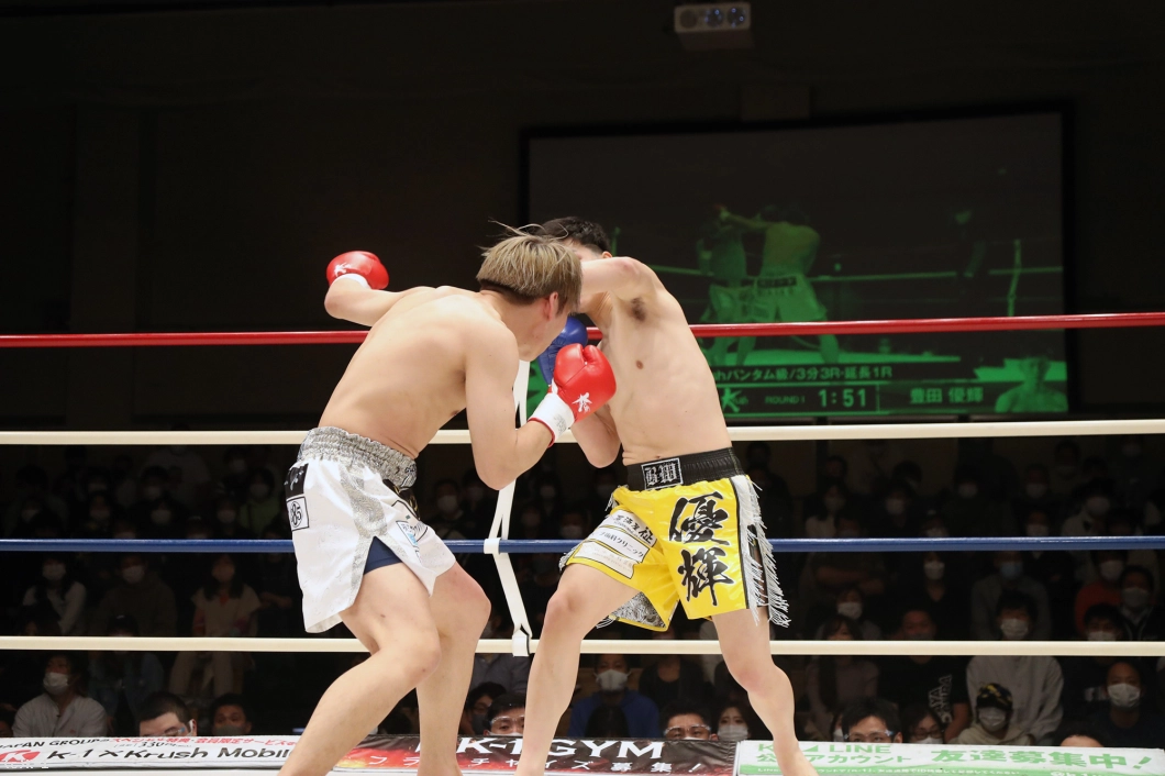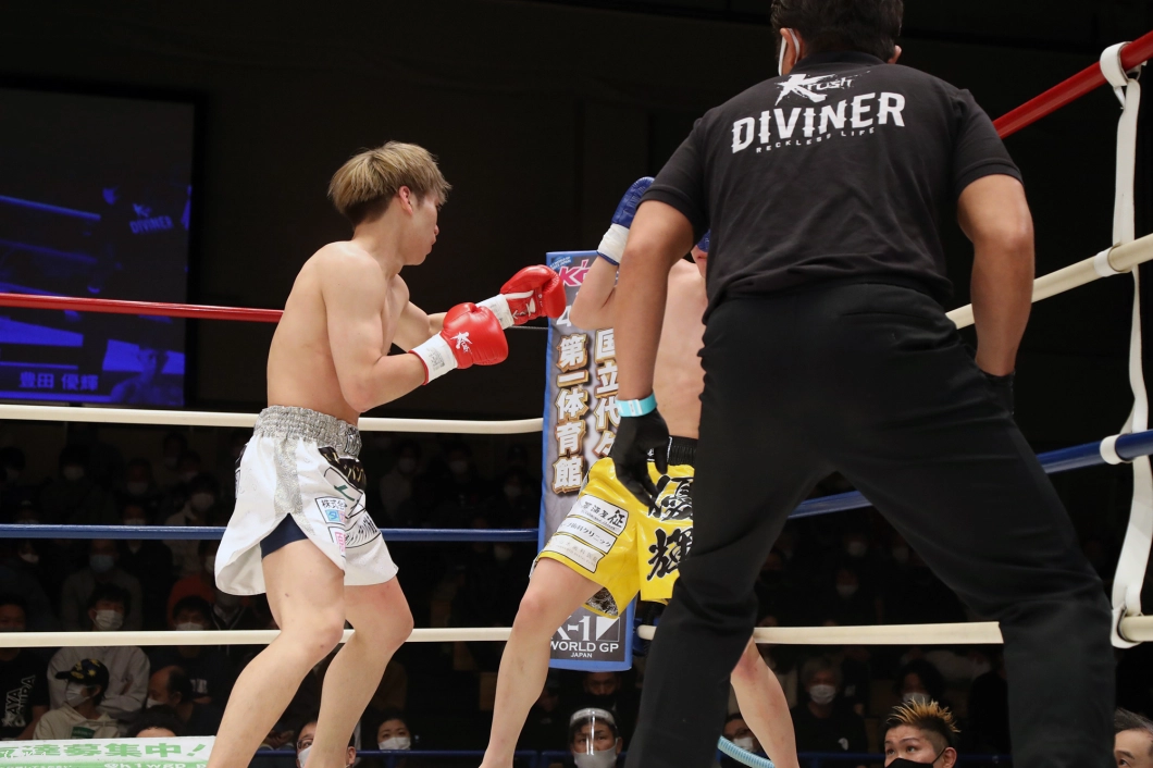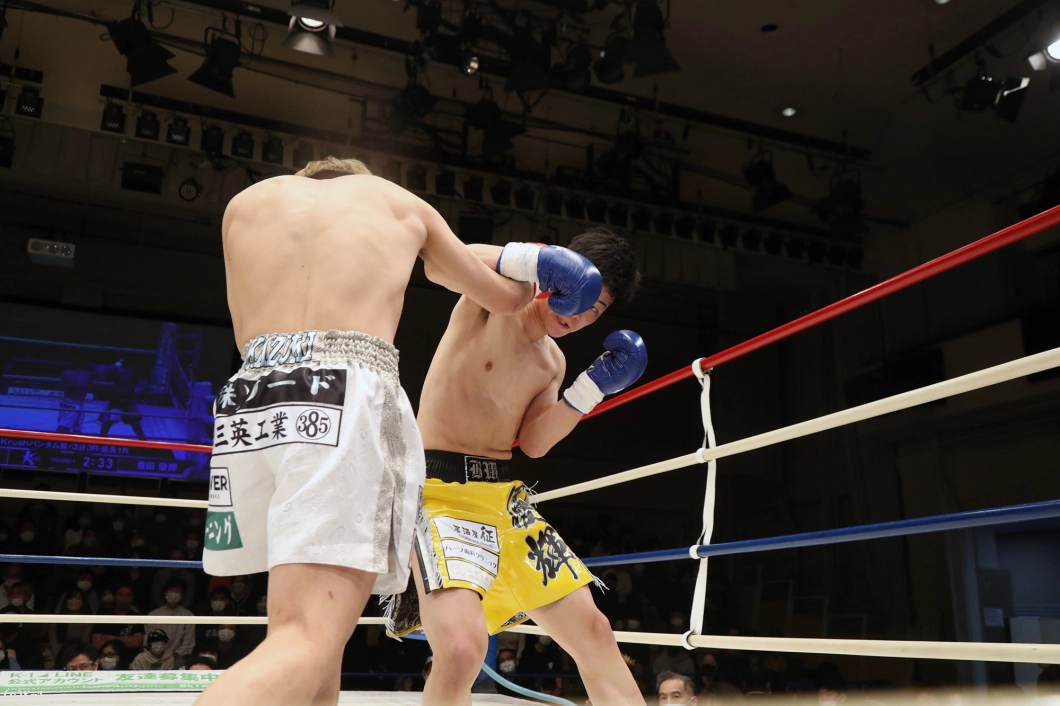 2R、右の三日月蹴りを入れた藤田は、そこから今度は右ストレートで豊田をダウンさせる。豊田は立ち上がるもダメージがあり、藤田は右フックで4度目のダウンを与えてフィニッシュした。
