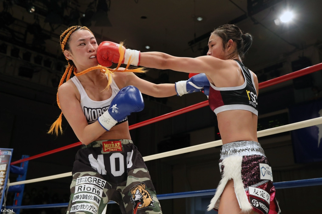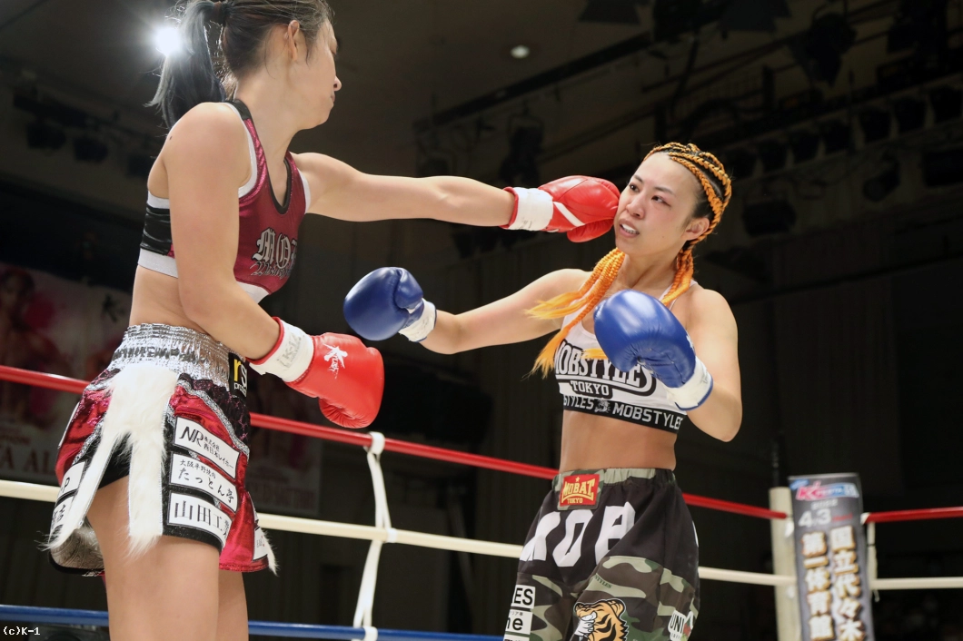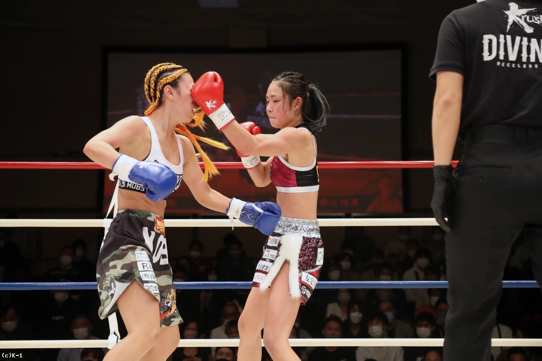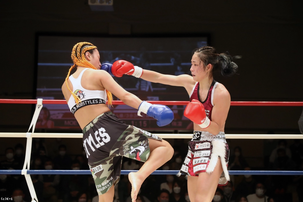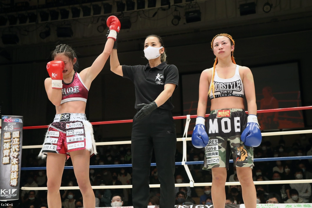 「久々の試合で、久々の勝ちでめっちゃうれしかったです。(対戦相手の印象は?)最後まで気が強くてずっと前に来て、むっちゃやりづらかったです。(今後の目標は?)今日みたいな試合内容じゃ6月のK-1女子大会にアピールできないと思うんですけど、6月までにしっかり仕上げるんで(K-1女子大会に)出れたらいいなと思います」
