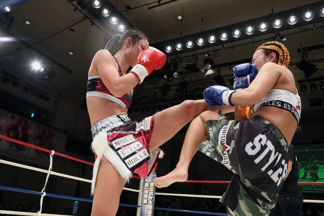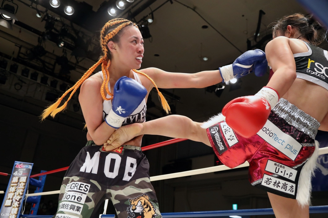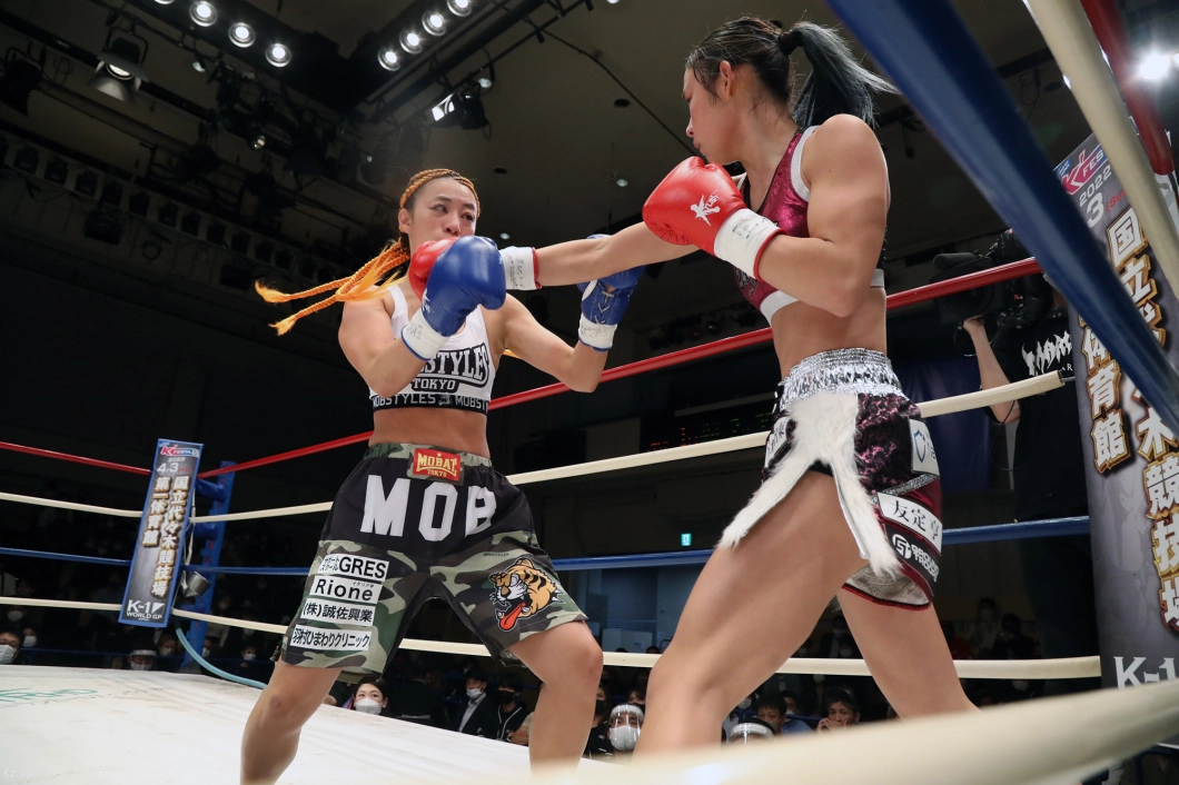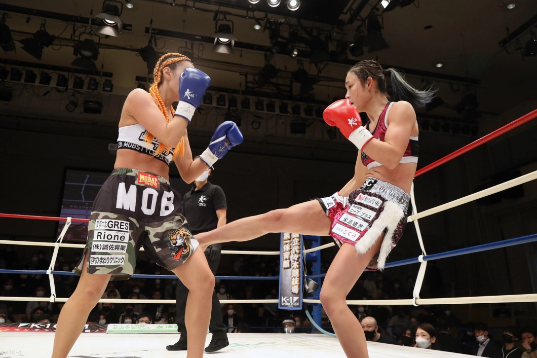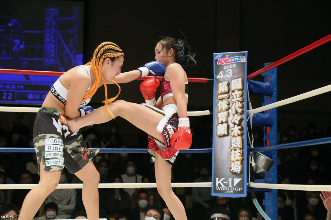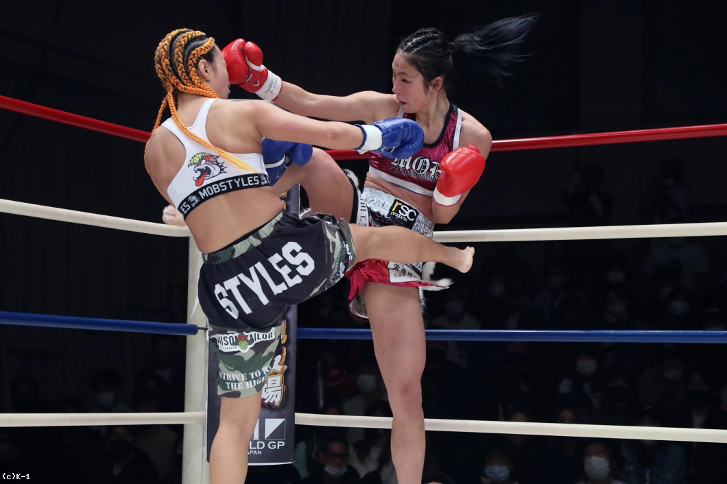 「久々の試合で、久々の勝ちでめっちゃうれしかったです。(対戦相手の印象は?)最後まで気が強くてずっと前に来て、むっちゃやりづらかったです。(今後の目標は?)今日みたいな試合内容じゃ6月のK-1女子大会にアピールできないと思うんですけど、6月までにしっかり仕上げるんで(K-1女子大会に)出れたらいいなと思います」