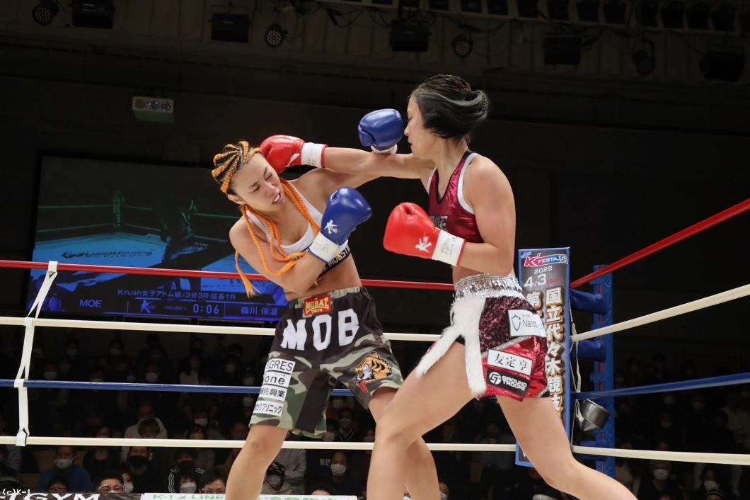 延長R、森川が前に進んでフックとミドルを放つが、MOEは早めに横・後ろにステップして距離を作り、ジャブとストレートで応戦する。両者消耗戦となるが、MOEは連打をまとめそこからボディにミドルキック。判定は3者10-9でMOE。勝利が決すると吠えるように声を発し表情を崩した。