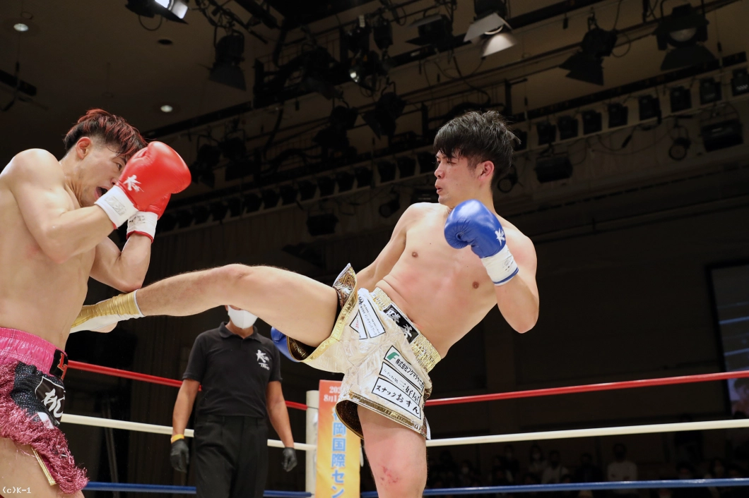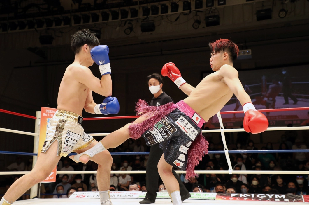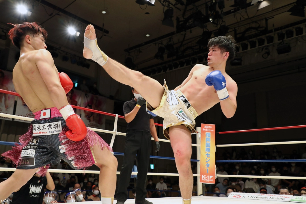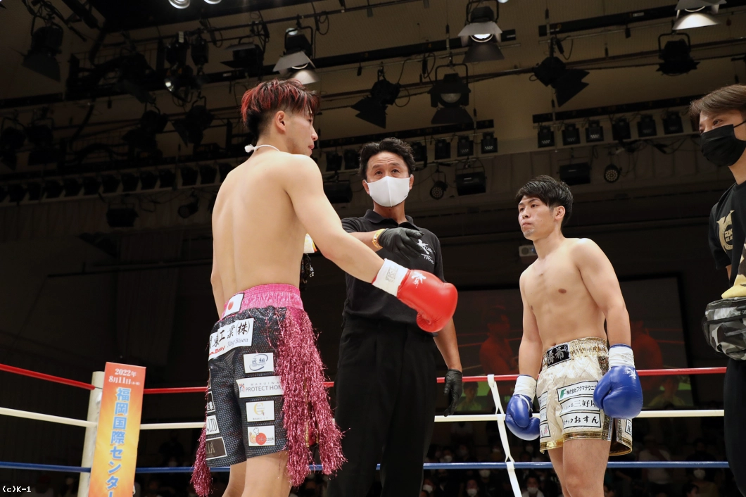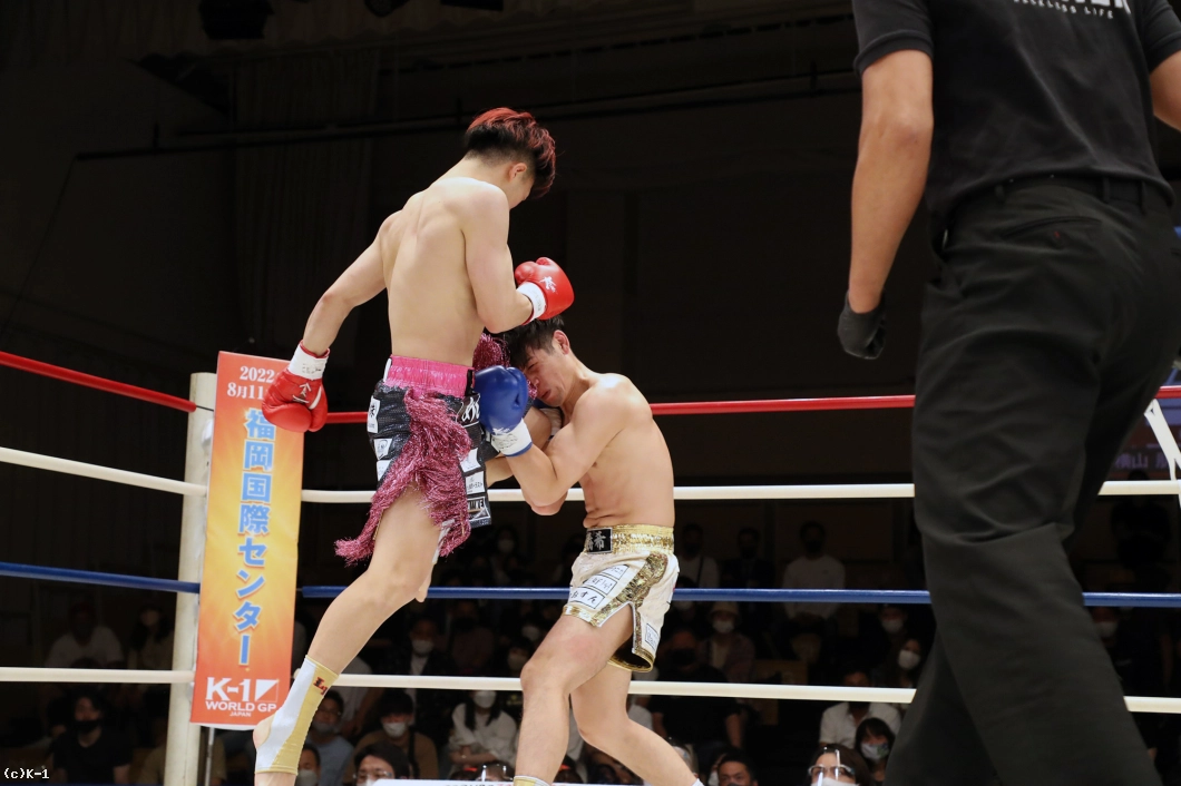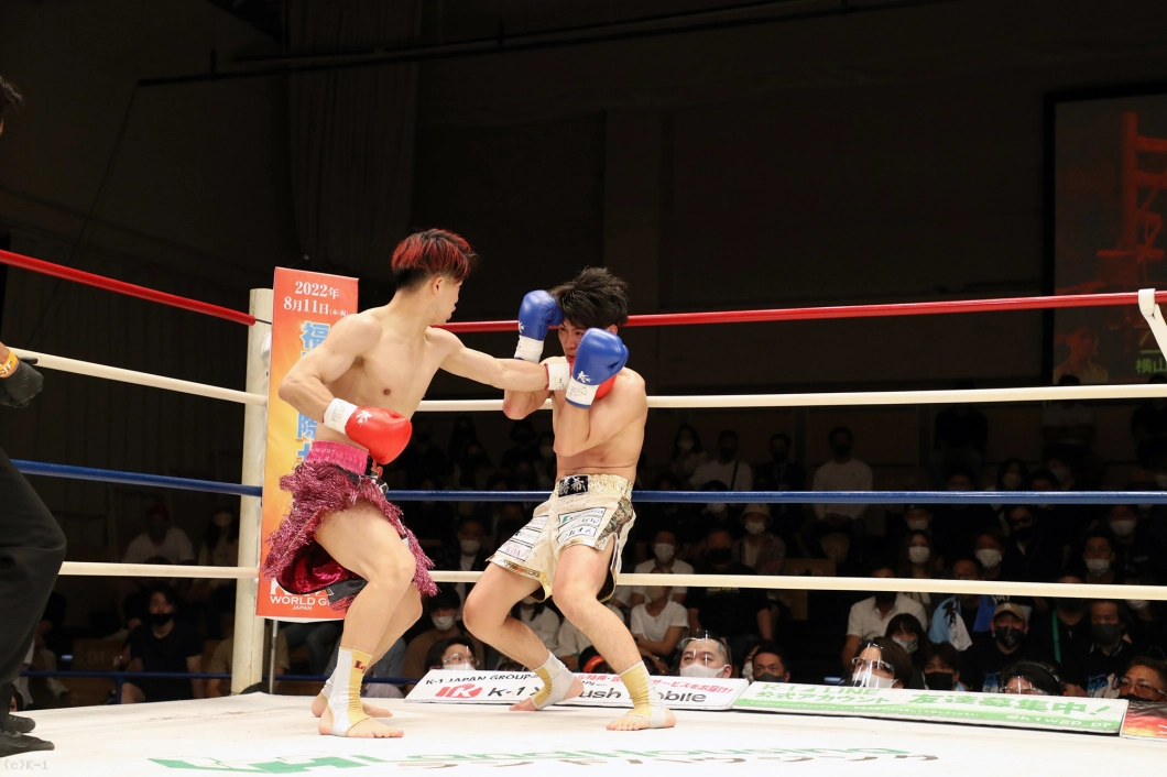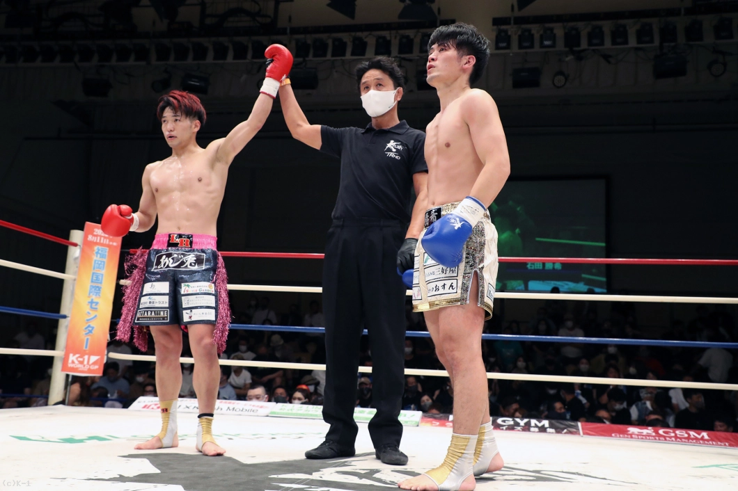 1R、横山はサウスポーでリング中央に立ち踏み込む隙を狙っているか。だが石田は右インローを入れ、横山が出てきてもバックステップでかわす。横山はボディへの飛びヒザも石田はダメージを見せず、その後もサイドに回って圧力をかわしていたが、横山が左ストレートでとらえダウンを奪う。立ち上がった石田に横山は続けて飛びヒザでダウンを追加し初回を終える。